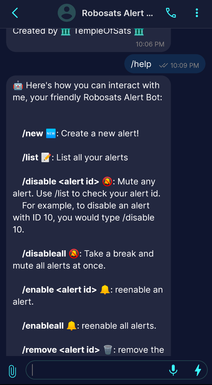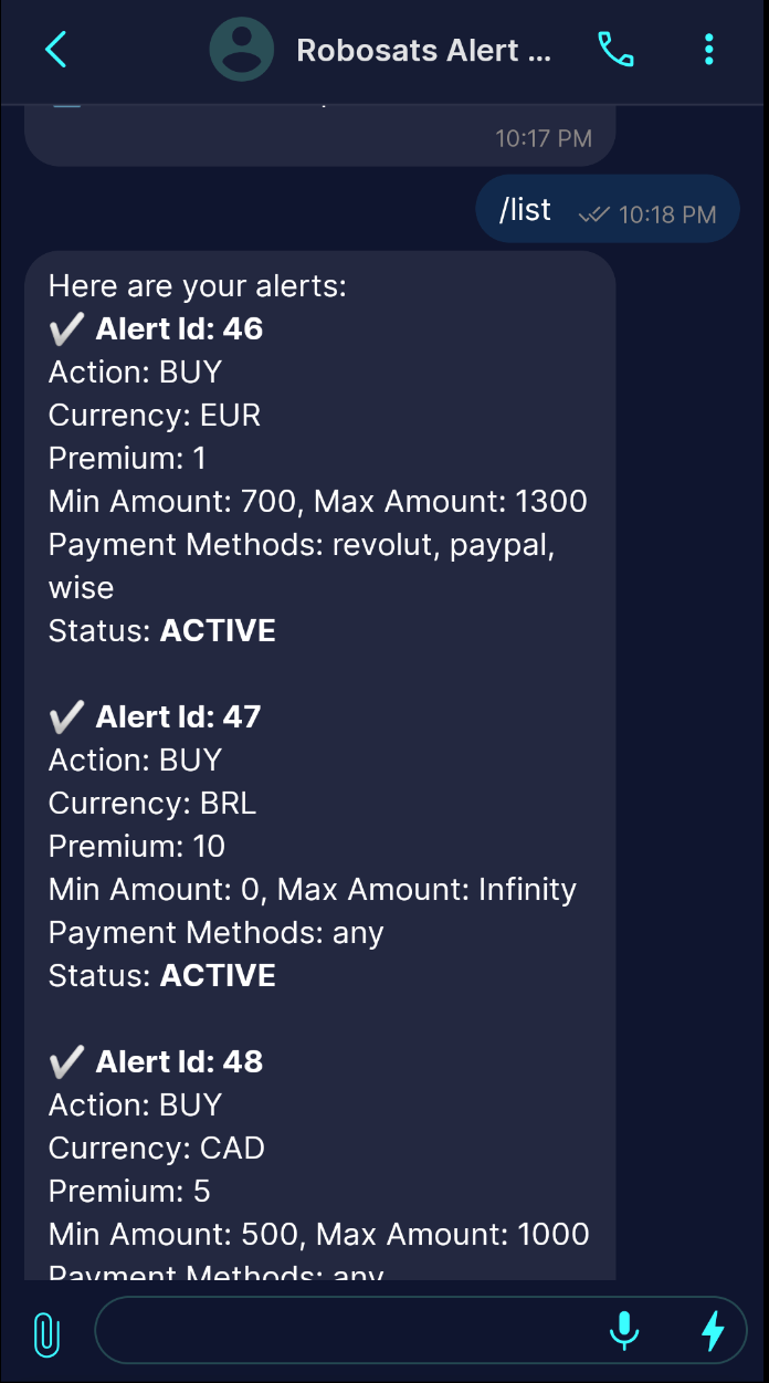 View your alerts by typing /list. You can enable, disable, or delete them as needed. Alerts have a 7-day lifetime by default, but you can extend this with /extend command.