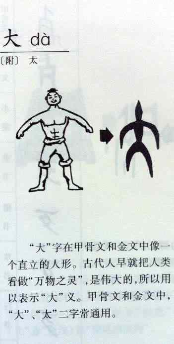 You can see that 大 resembles a majestic-looking person standing with his arms and legs spread out wide. Ancient people considered themselves to be the master of all sentient beings. This may account for the open body language; that’s why 大 means big.