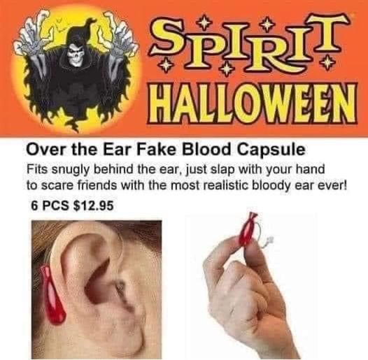 Fits snugly behind the ear, just slap with your hand ... most realistic bloody ear ever! 6 pieces $12.95.
