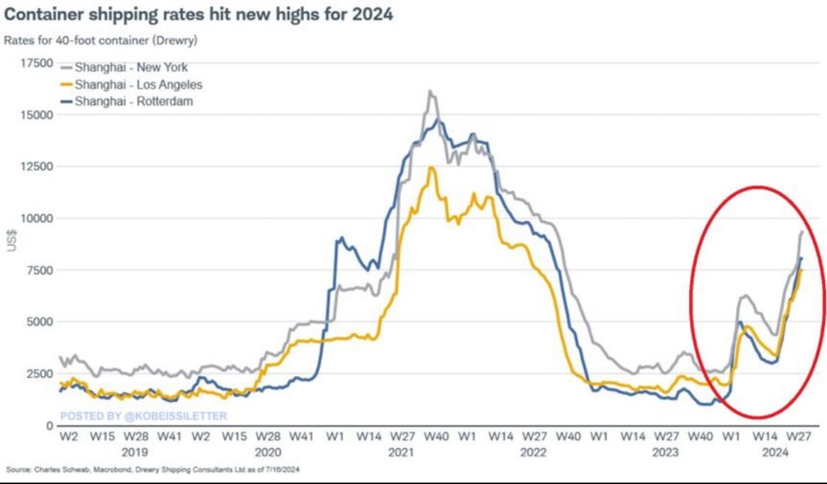If freight rates are a leading indicator for inflation this time too, then the next big wave is just getting ready. Geopolitical tensions (conflicts in the bottlenecks like the Red Sea), the escalating trade war between the US/EU and China and problems in supply chains are likely to continue to drive this development in the medium term.
