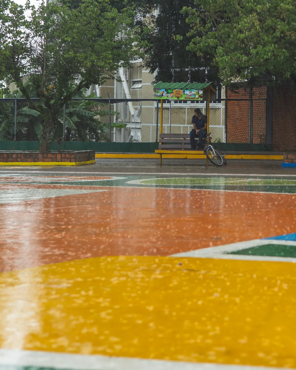 In the first photograph, I was at the park when it started to rain heavily, so I had to wait under cover for the downpour to pass. As I was there, this man found himself in the same situation.