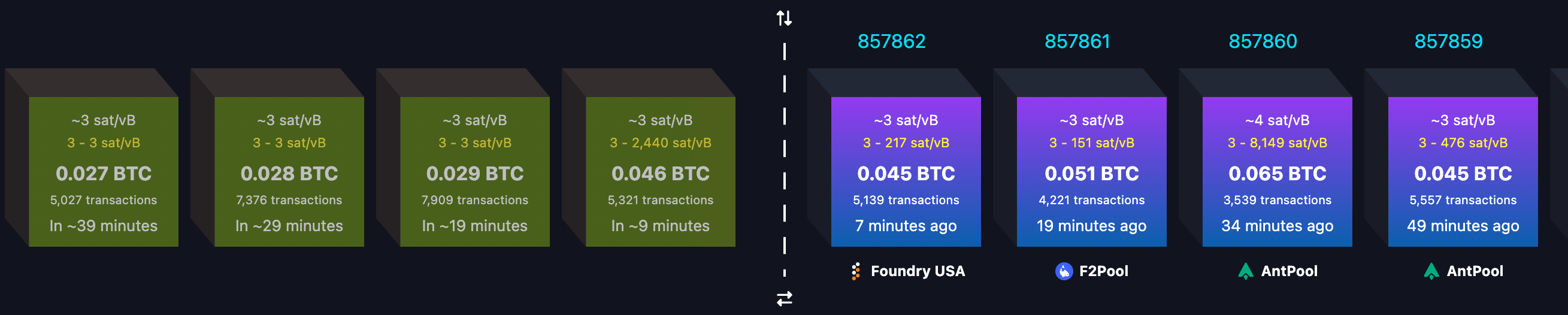Purple blocks on the right are confirmed blocks with information about the fee rate (sat/vB), about when the block was produced, and the number of transactions in the block.
