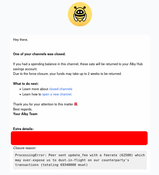 Due to this huge onchain fee spike a few users saw channel force closures. This is a normal protective measure by the lightning implementation and the sats will become available in the savings balance. Alby Cloud subscribers will receive a new payment channel thanks to the collaboration with our LSP.