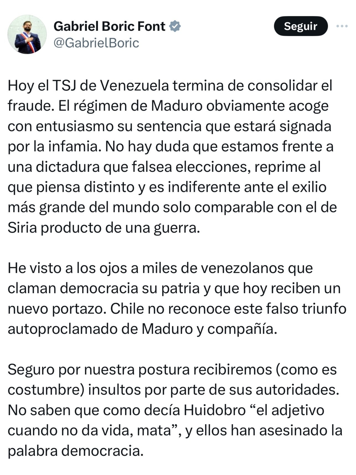 "Today the TSJ of Venezuela finishes consolidating the fraud. The Maduro regime obviously welcomes his sentence with enthusiasm, which will be marked by infamy. There is no doubt that we are facing a dictatorship that falsifies elections, represses those who think differently and is indifferent to the largest exile in the world only comparable to that of Syria as a result of a war.