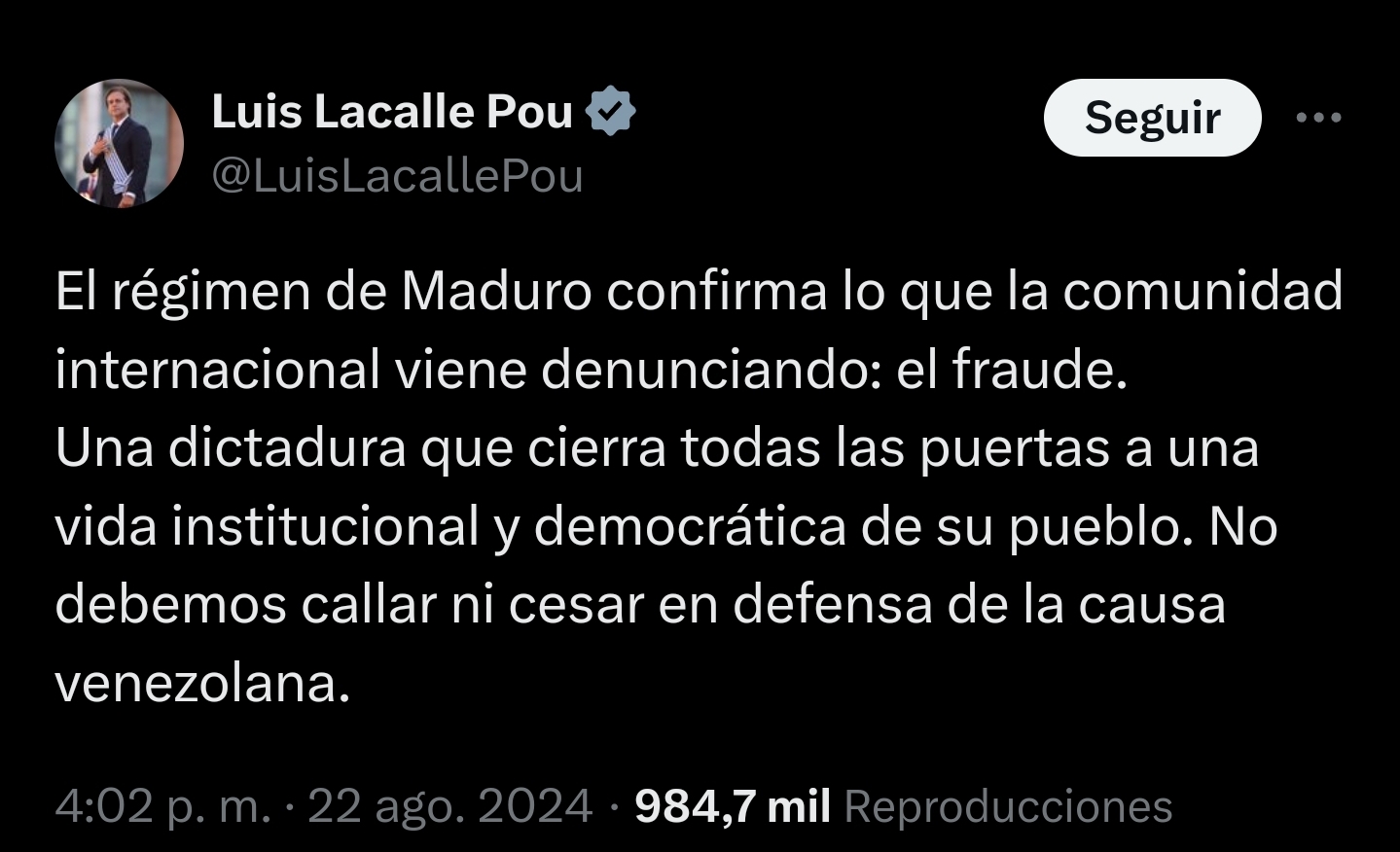 A dictatorship that closes all doors to an institutional and democratic life for its people. We must not remain silent or cease in defense of the Venezuelan cause."