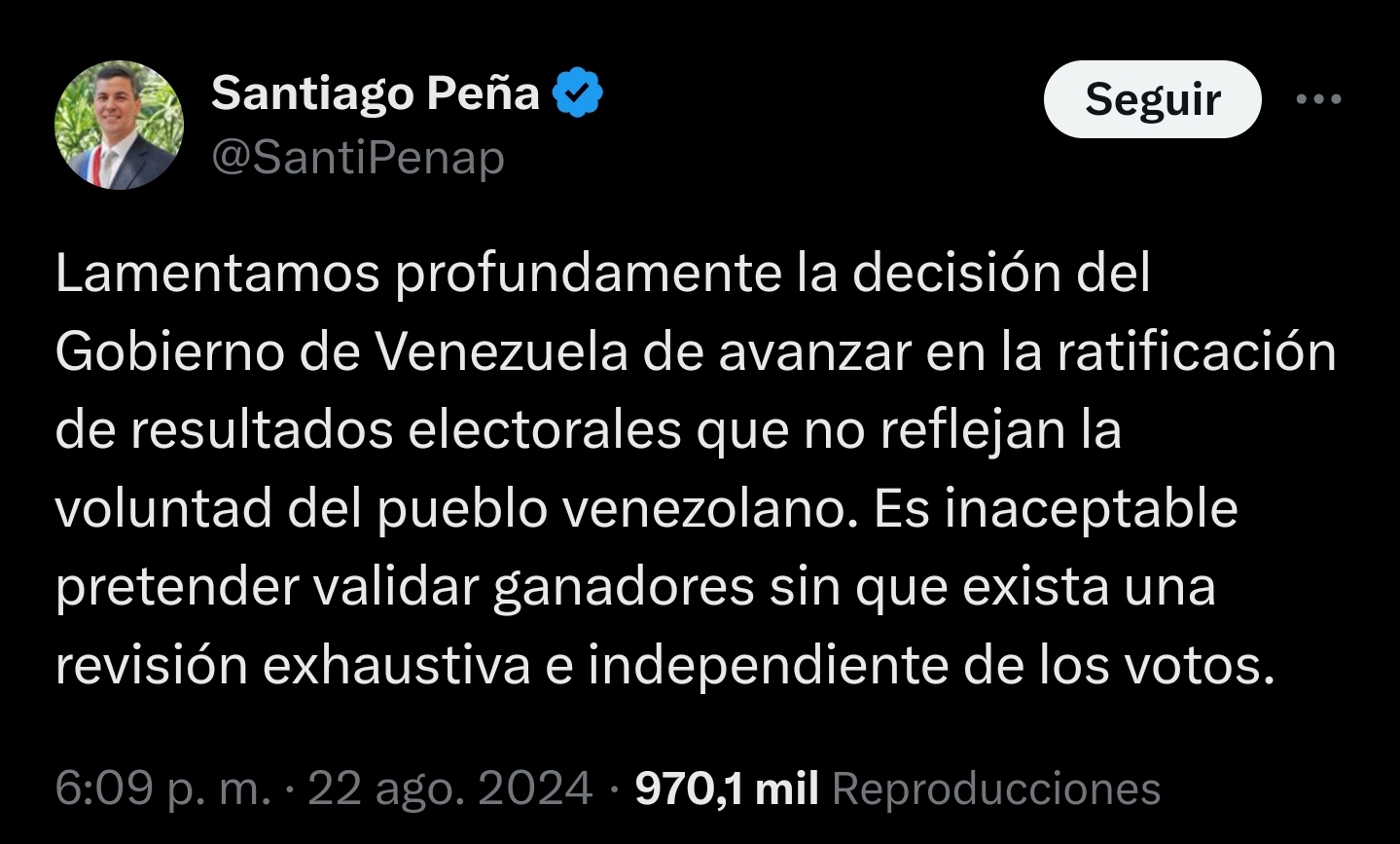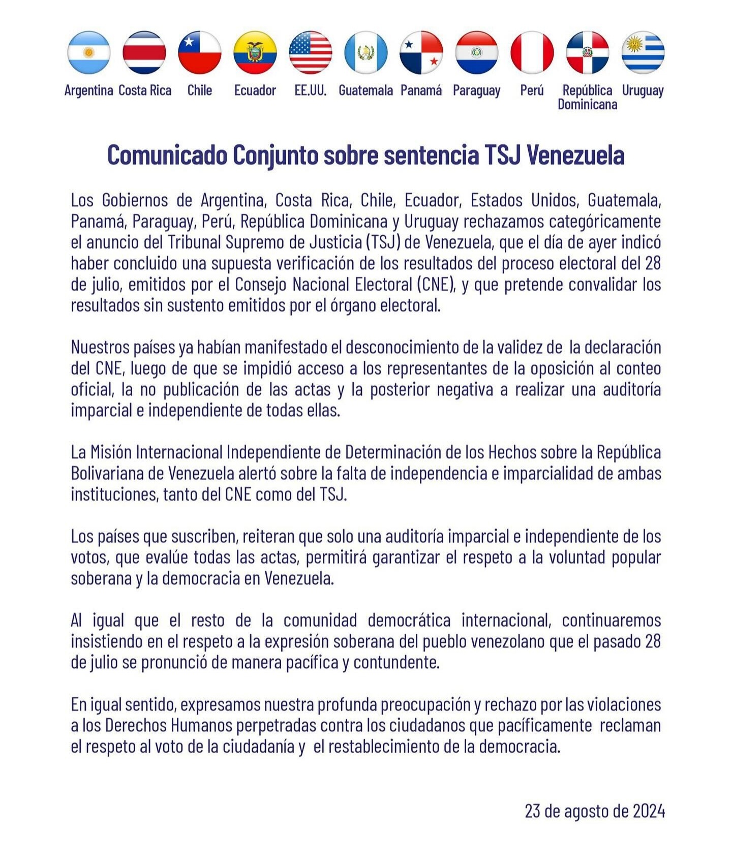 The Governments of Argentina, Costa Rica, Chile, Ecuador, the United States, Guatemala, Panama, Paraguay, Peru, the Dominican Republic and Uruguay categorically reject the announcement by the Supreme Court of Justice (TSJ) of Venezuela, which yesterday indicated that it had concluded a alleged verification of the results of the electoral process of July 28, issued by the National Electoral Council (CNE), and which seeks to validate the unsupported results issued by the electoral body.