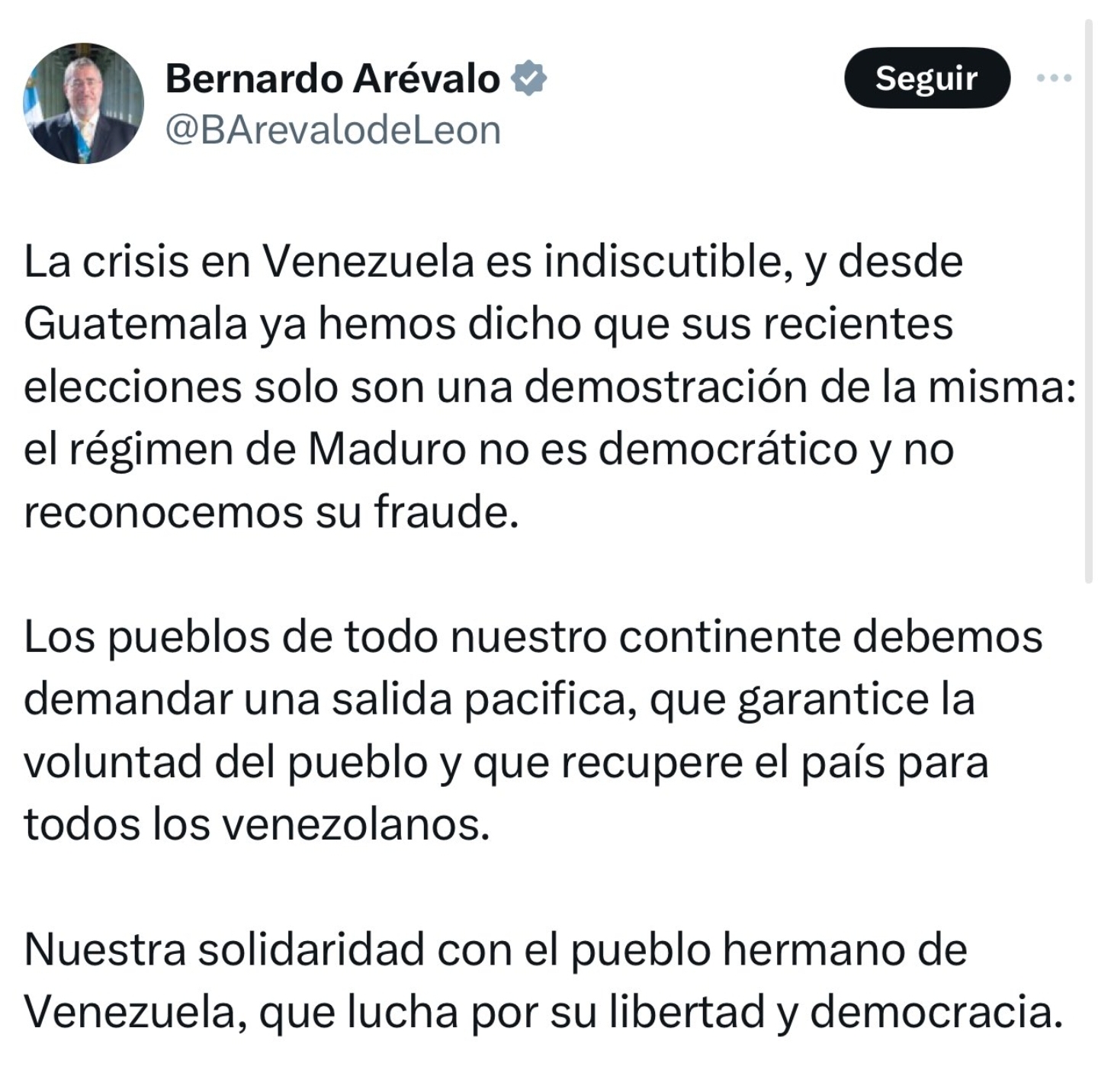 "The crisis in Venezuela is indisputable, and from Guatemala we have already said that its recent elections are only a demonstration of it: the Maduro regime is not democratic and we do not recognize its fraud.