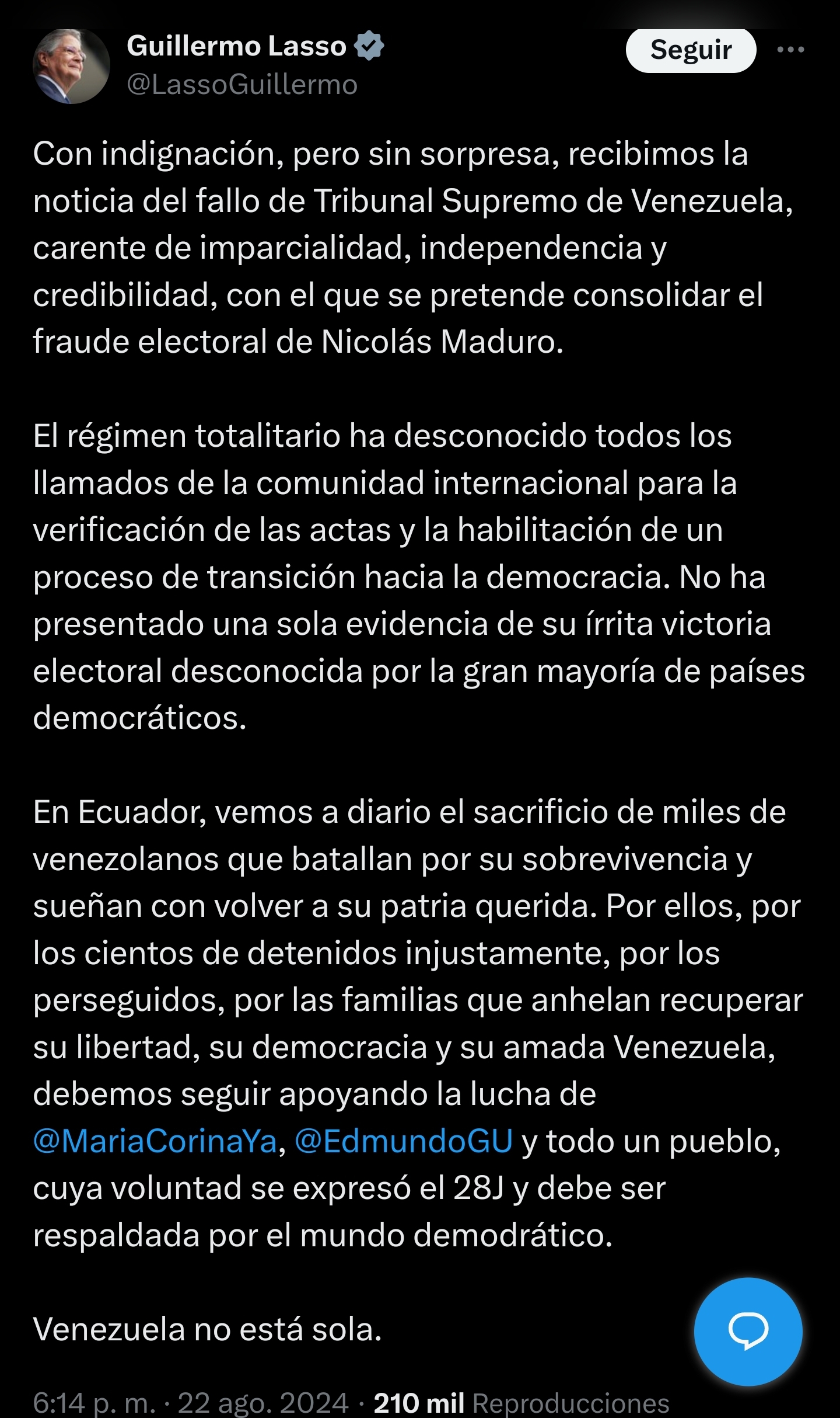 Maria Corina, Edmundo González and an entire people, whose will was expressed on June 28 and must be supported by the democratic world.