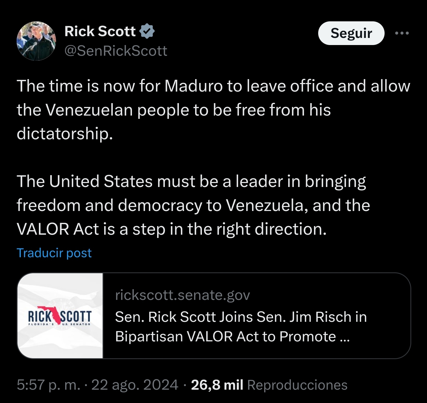 https://www.rickscott.senate.gov/2024/8/sen-rick-scott-joins-sen-jim-risch-in-bipartisan-valor-act-to-promote-democracy-in-venezuela
