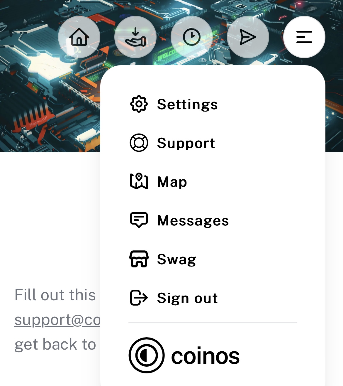 Hi! You can reach us via our support button on our home page Coinos.io.