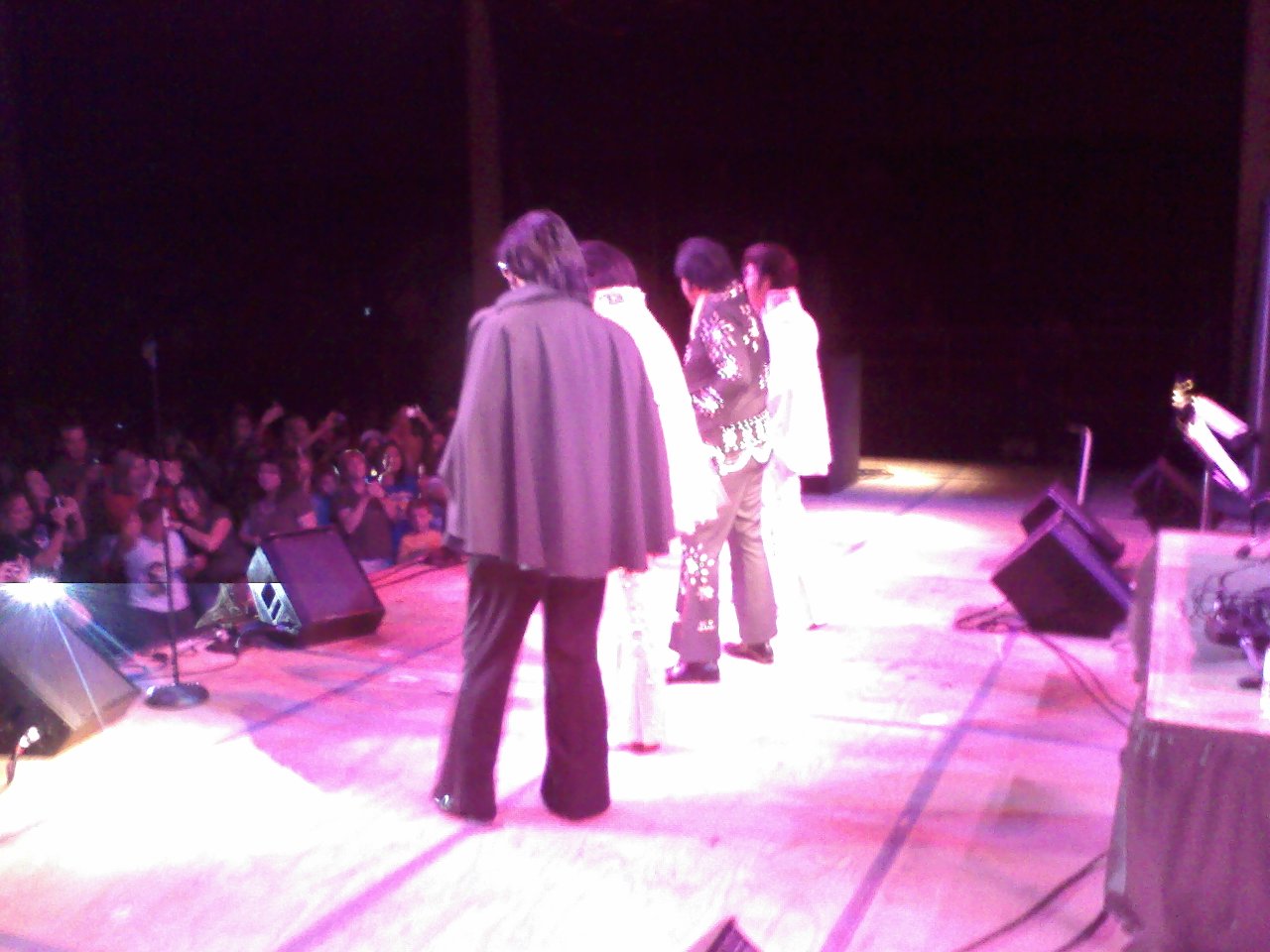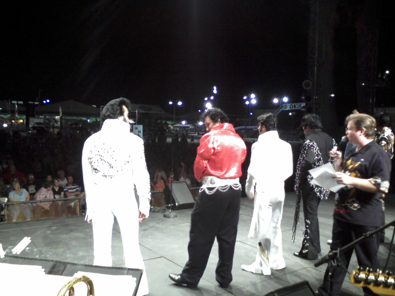 The week in question, we had one of these in Lubbock, Tx. Here's the Elvii all lined up again waiting to hear who won. Oddly enough, this is the only time I've been to Texas outside of an airport, including with other bands.