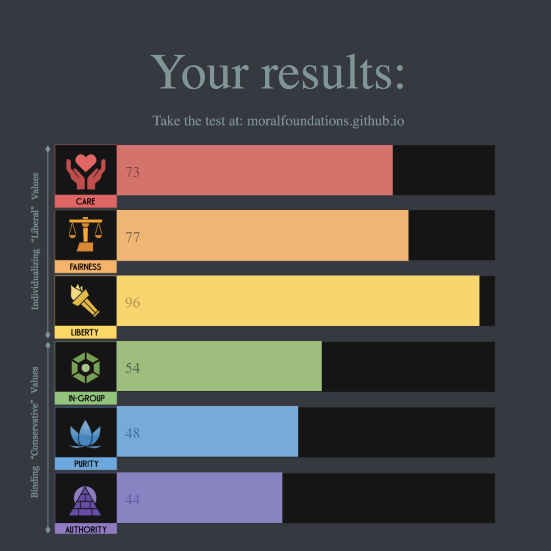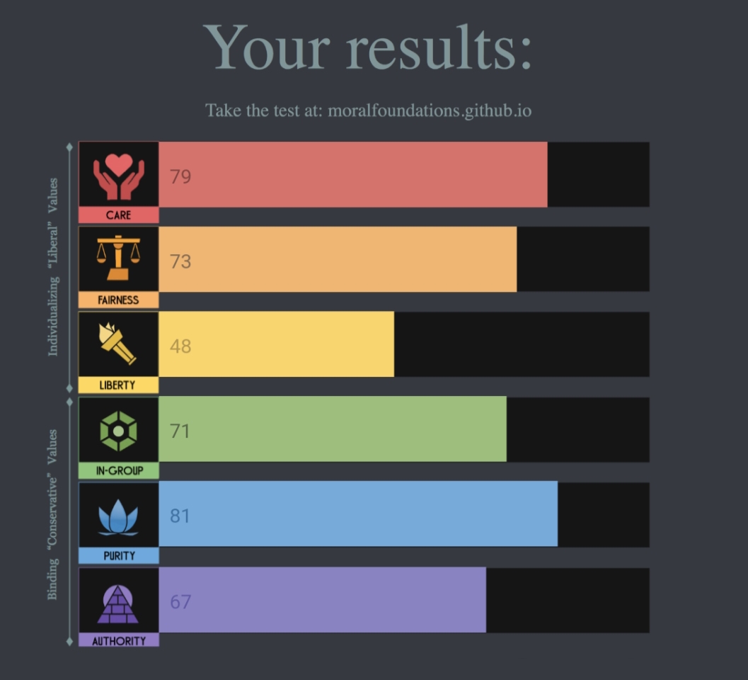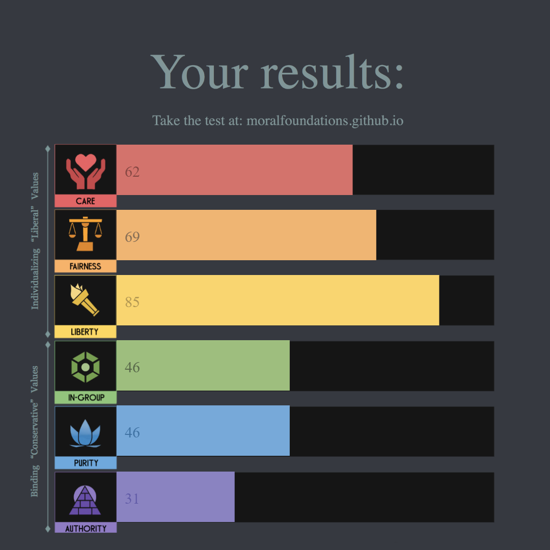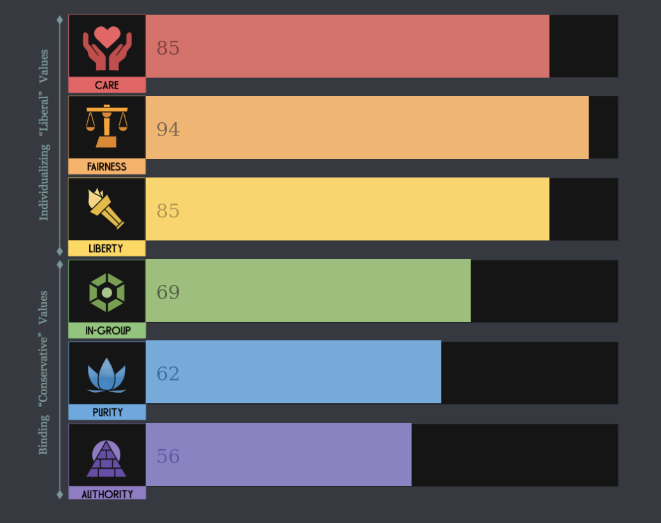 I think care and fairness are more closely linked to my personality than my ideology, not that you can really separate the two.