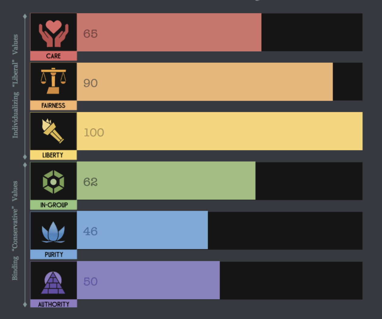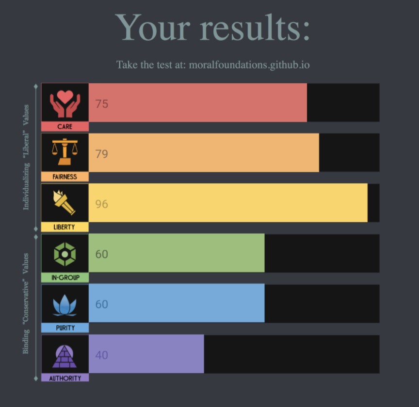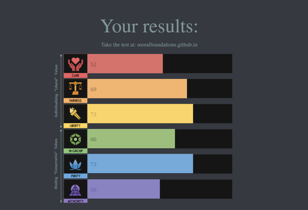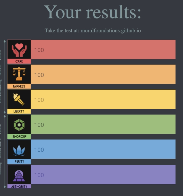 I think care and fairness are more closely linked to my personality than my ideology, not that you can really separate the two.