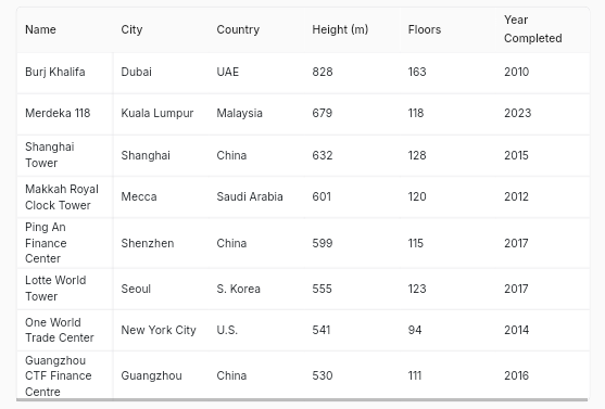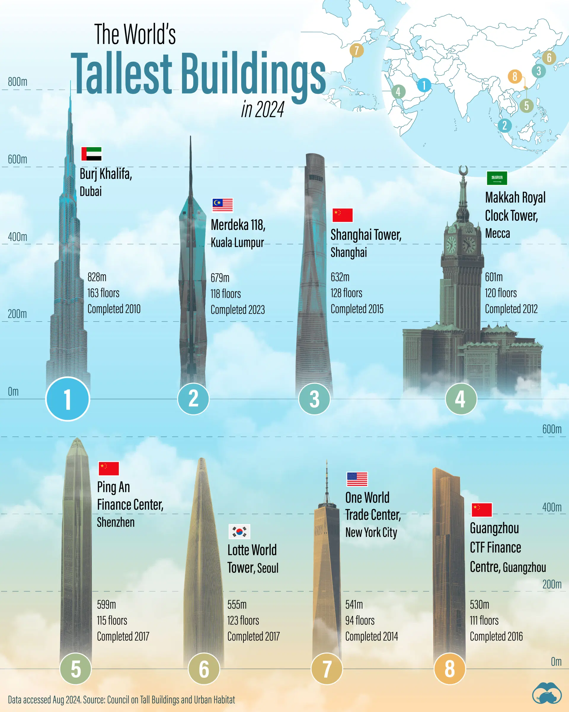 https://m.stacker.news/49011https://m.stacker.news/49012Details and source:https://www.skyscrapercenter.com/buildingshttps://www.visualcapitalist.com/ranked-the-worlds-tallest-skyscrapers-in-2024/