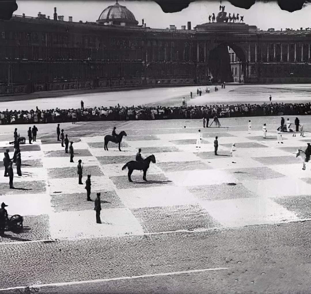 This extraordinary chess match took place in Leningrad (now St. Petersburg) in 1924. In this particular game, the chess pieces have been replaced by people, giving the event a unique and spectacular touch.