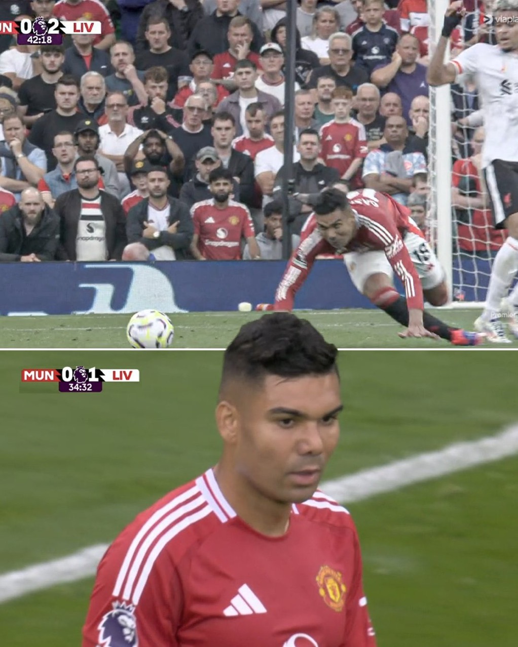 Liverpool defeated Manchester United 3-0 at Old Trafford. Luis Diaz scored twice in the first half, and Mohamed Salah added another in the second. Casemiro struggled to control the midfield for Manchester United, failing to stop Liverpool's attacks and making defensive errors that contributed to United's overall poor performance