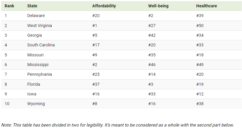 Delaware seems odd, but I've also never spent anytime there. Otherwise, it's a little surprising none of the Southwest states made the list. Lots of people retire there.