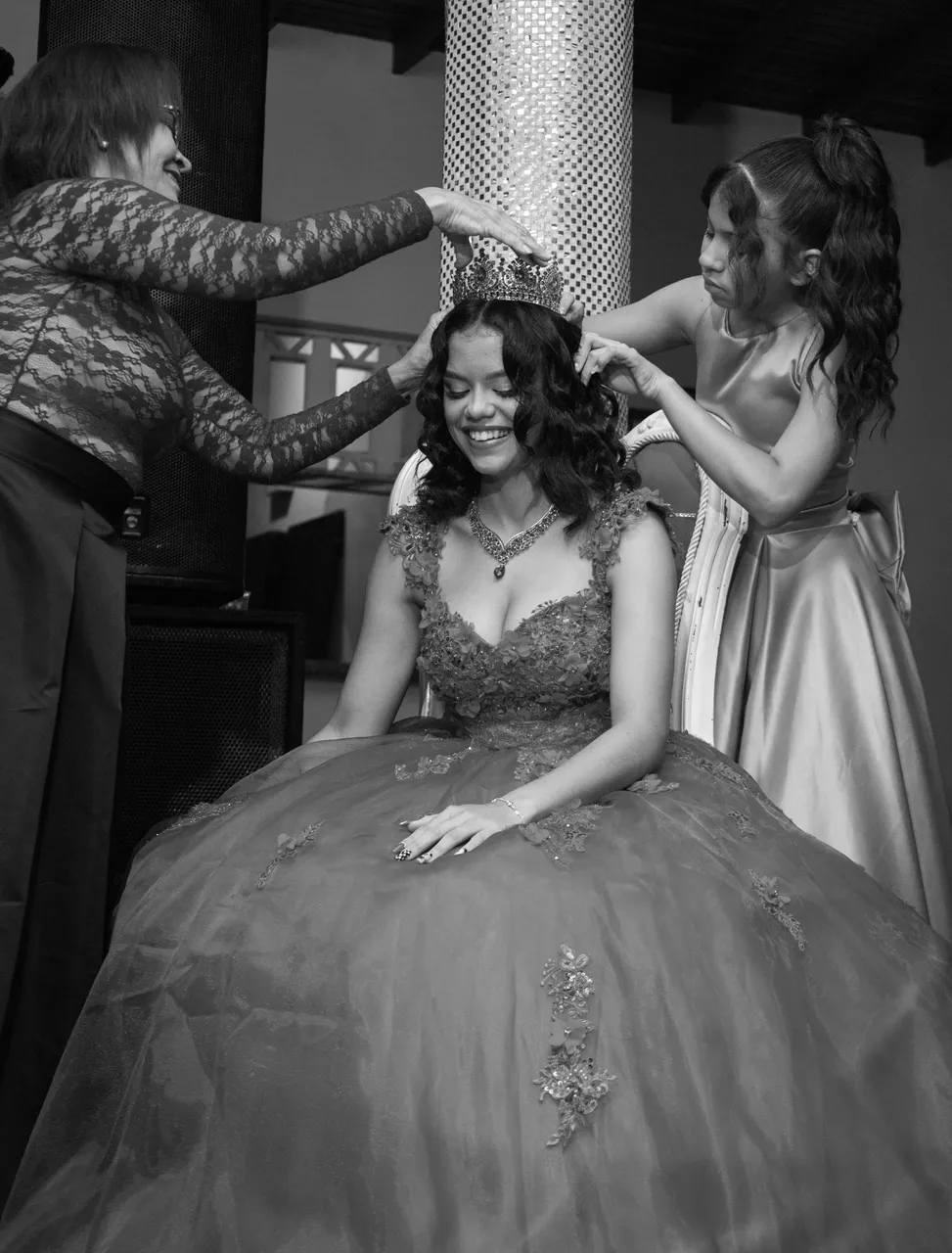 Then the mother and sister proceed to put a crown on her.