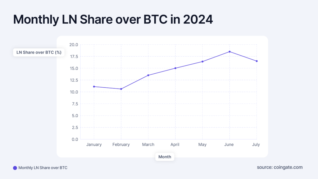 - The percentage of Bitcoin payments processed via the Lightning Network at CoinGate has more than doubled in two years from 6.5% in Q2 2022 to 16.6% in Q2 2024.