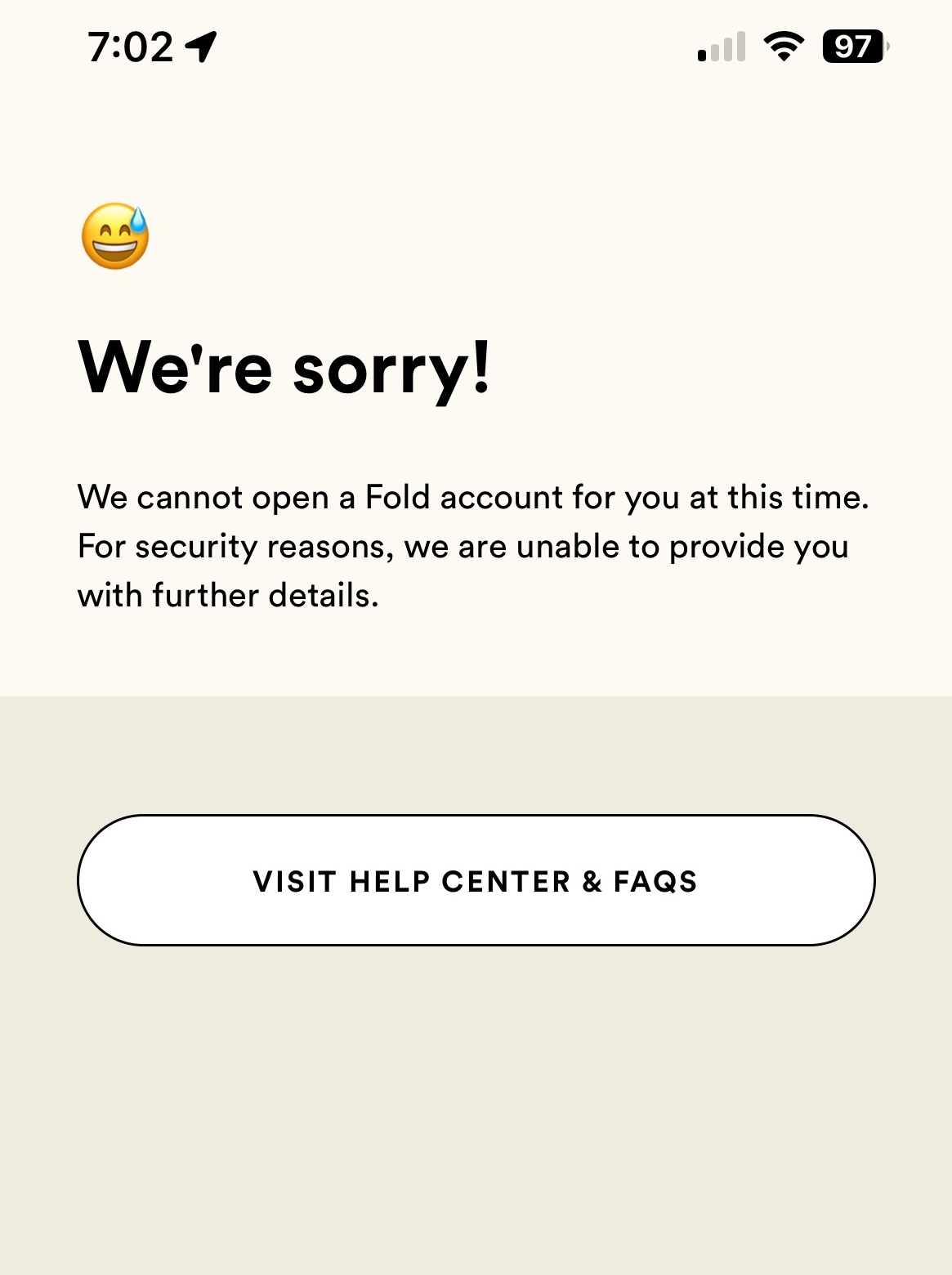 I don't know about Fold, but I've had an attempt to open a bank account declined in the UK without an explanation. (Presumably based on the data I provided in the form about my finances and intended use of the account).