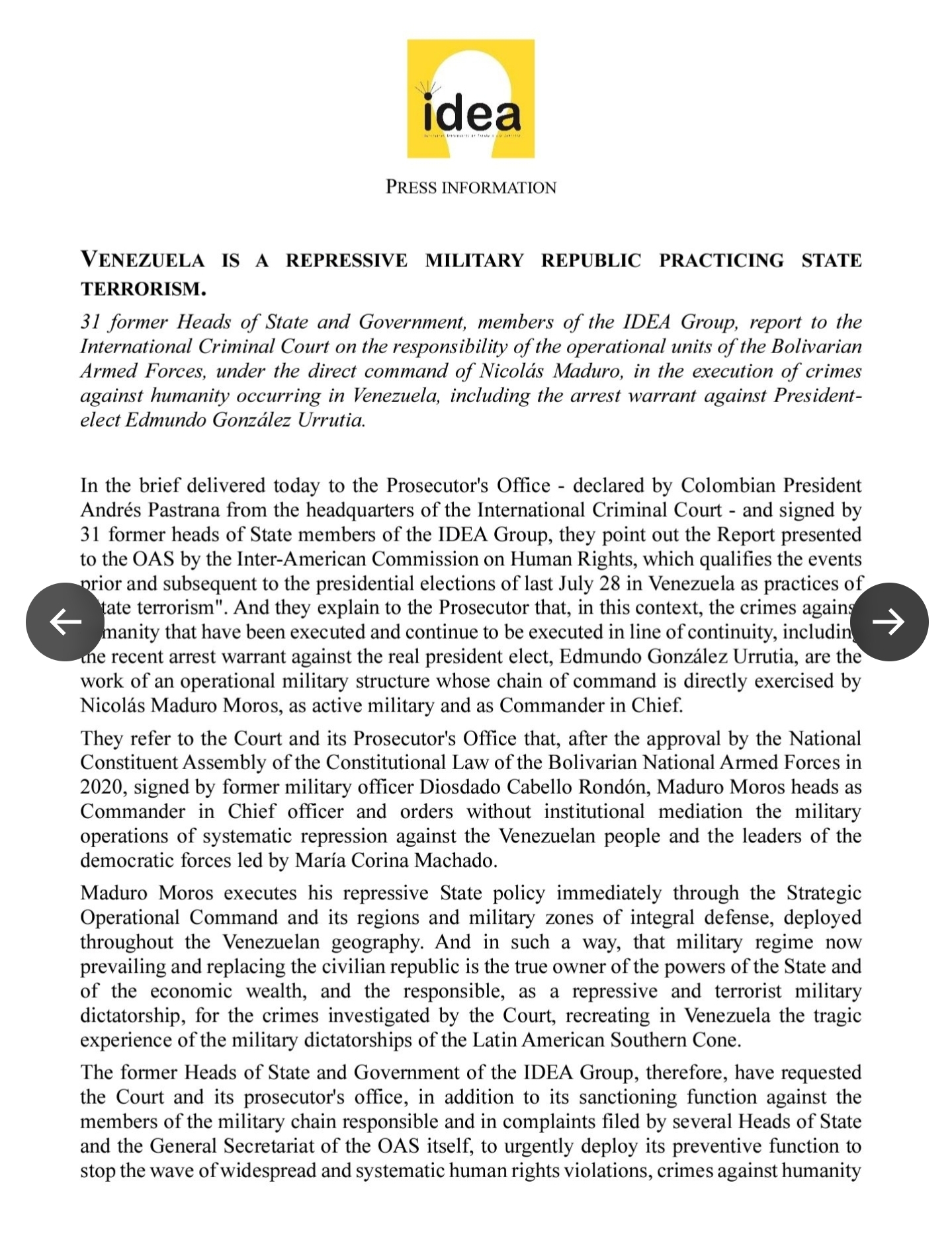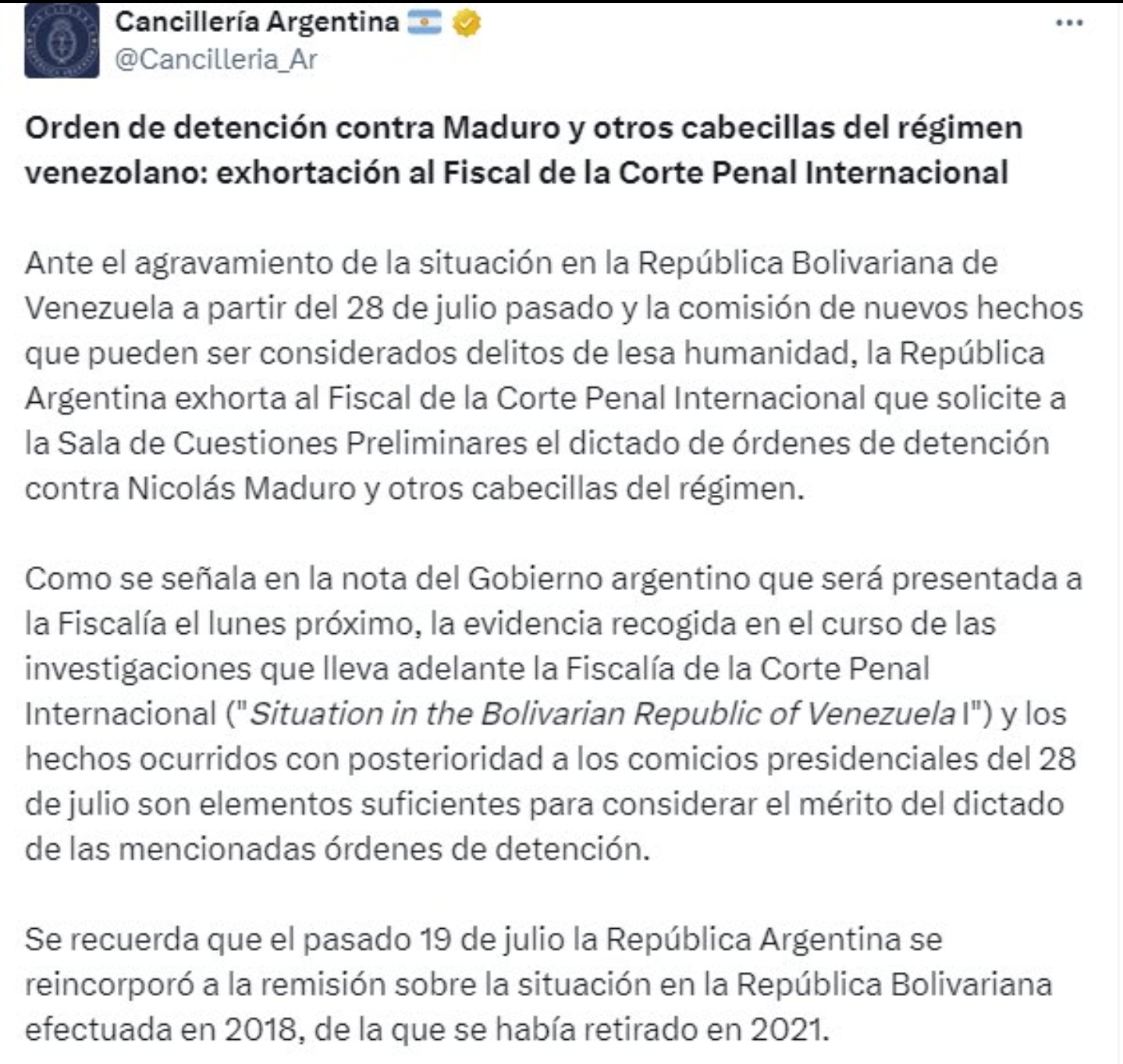 Given the worsening of the situation in the Bolivarian Republic of Venezuela since July 28 and the commission of new acts that may be considered crimes against humanity, the Argentine Republic urges the Prosecutor of the International Criminal Court to request the Pre-Trial Chamber to issue arrest warrants against Nicolás Maduro and other leaders of the regime.