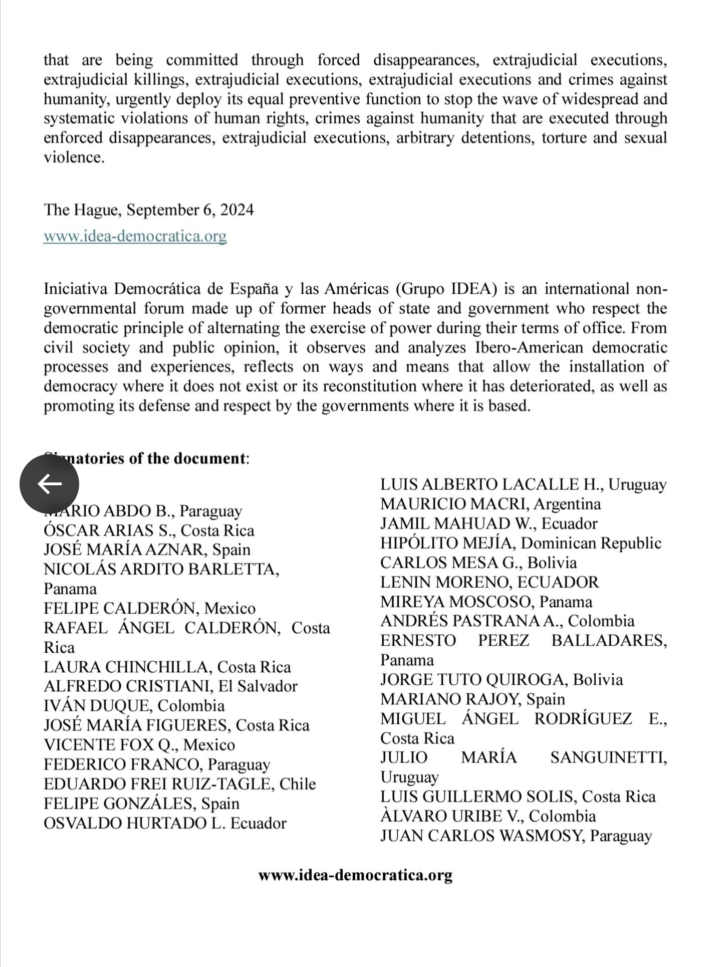 The intervention of the International Criminal Court and the arrest of Nicolás Maduro and Diosdado Cabello, as well as the entire chain of command for the commission of Crimes Against Humanity, have been urgently requested. The request is made by 30 former presidents of Latin America and Spain, in The Hague, through a document that shows that the Venezuelan State is a military and repressive State that carries out State Terrorism.