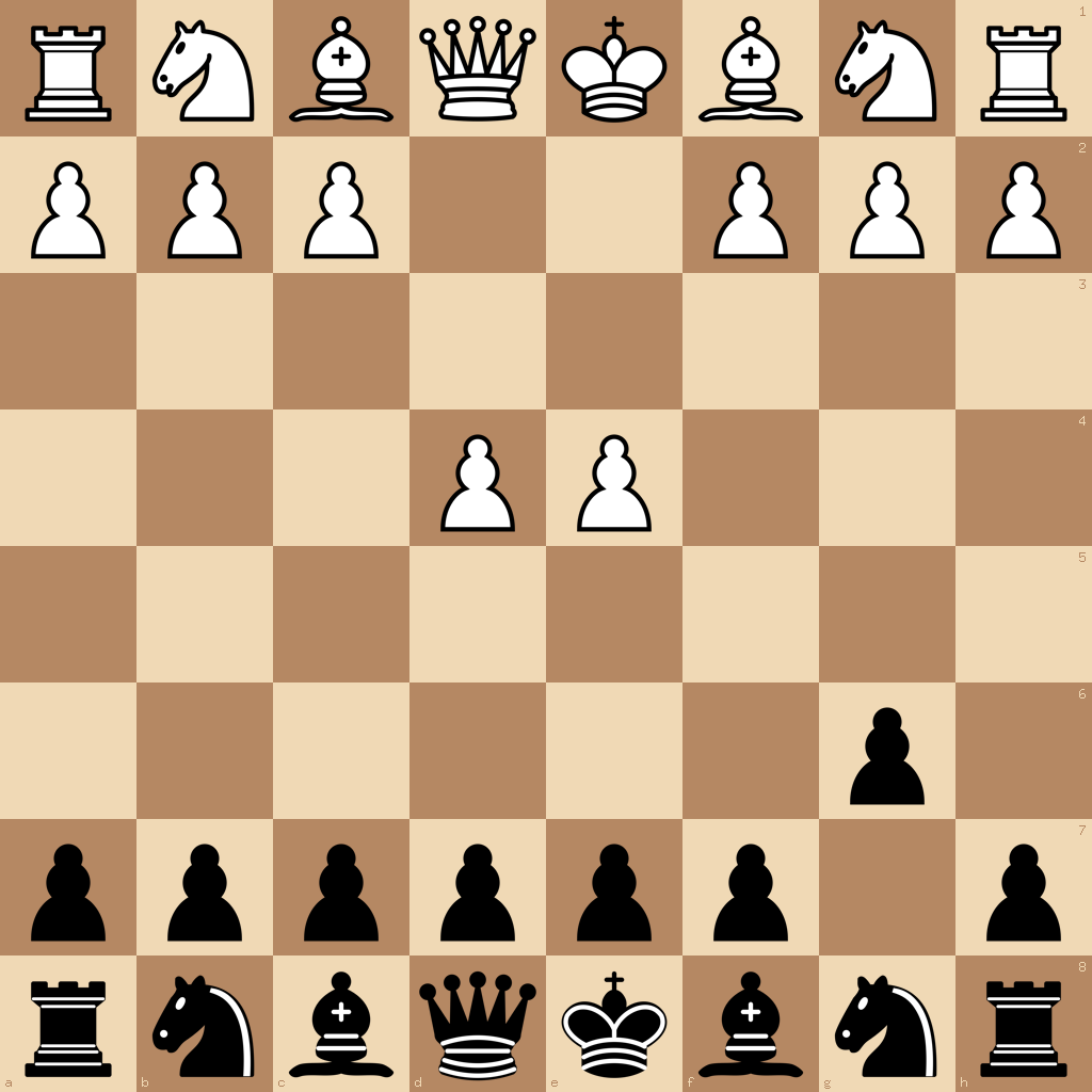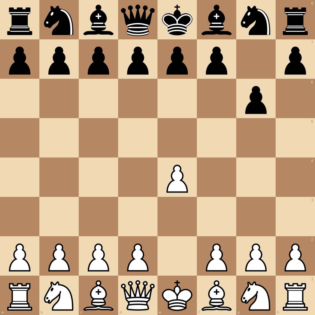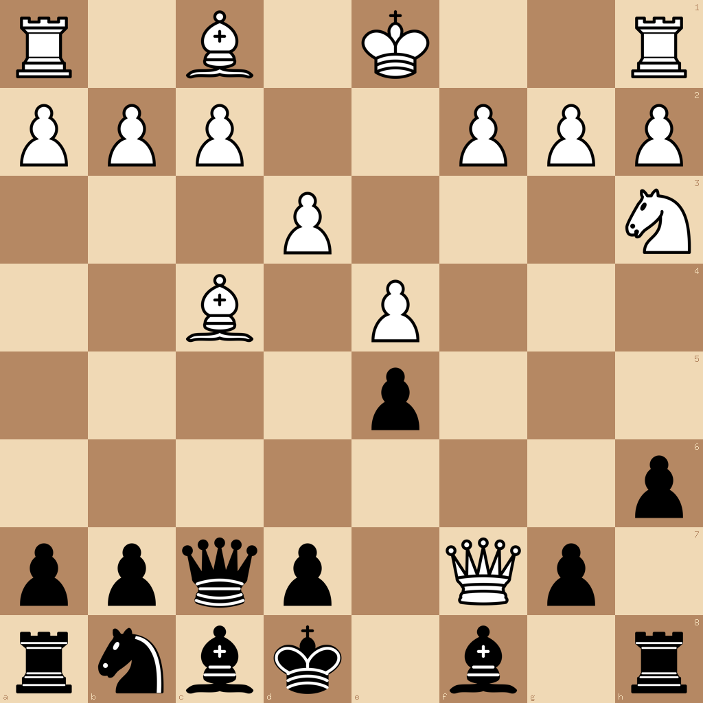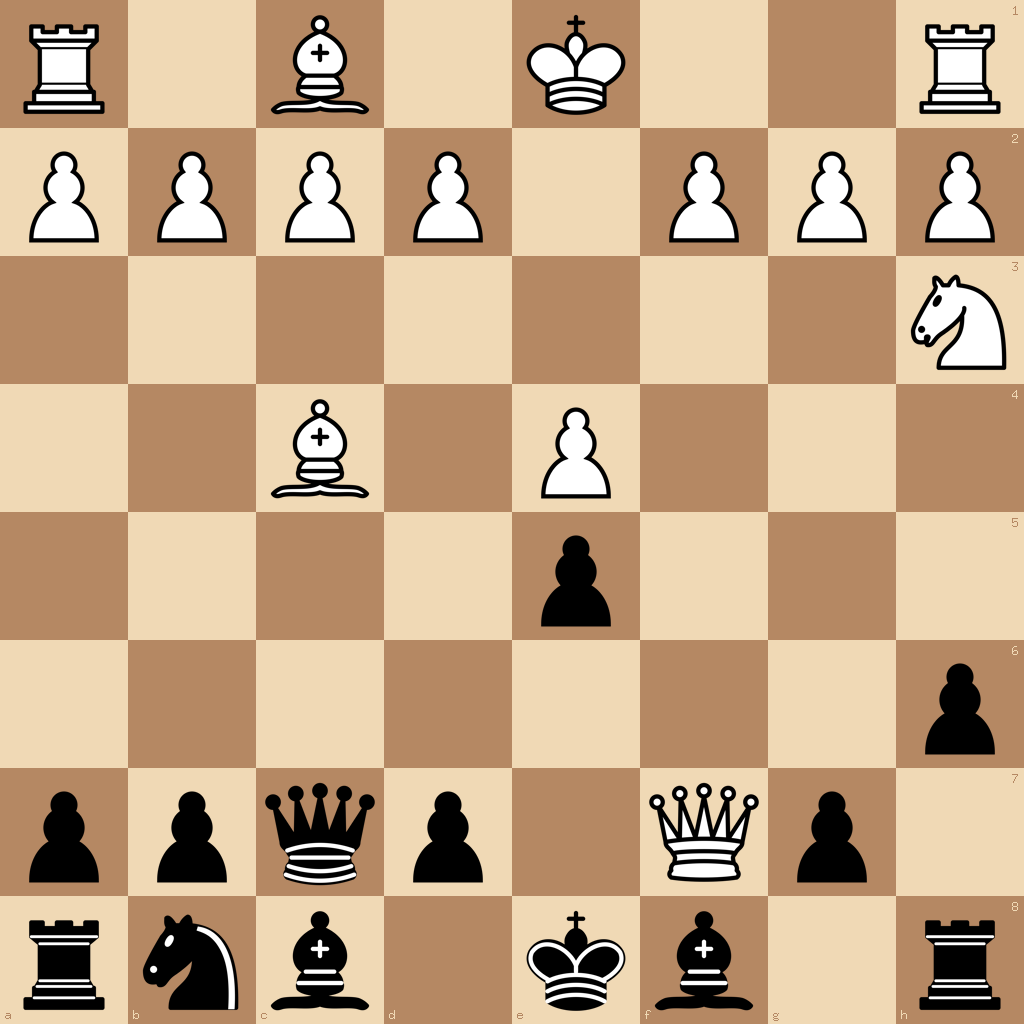 1.e4 Nf6 2.Nc3 Ng4 3.Nh3 e5 4.Qxg4 h6 5.Bc4 Qf6 6.Nd5 Qg6 7.Qf3 Qc6 8.Nxc7+ Qxc7 9.Qxf7+ Kd8