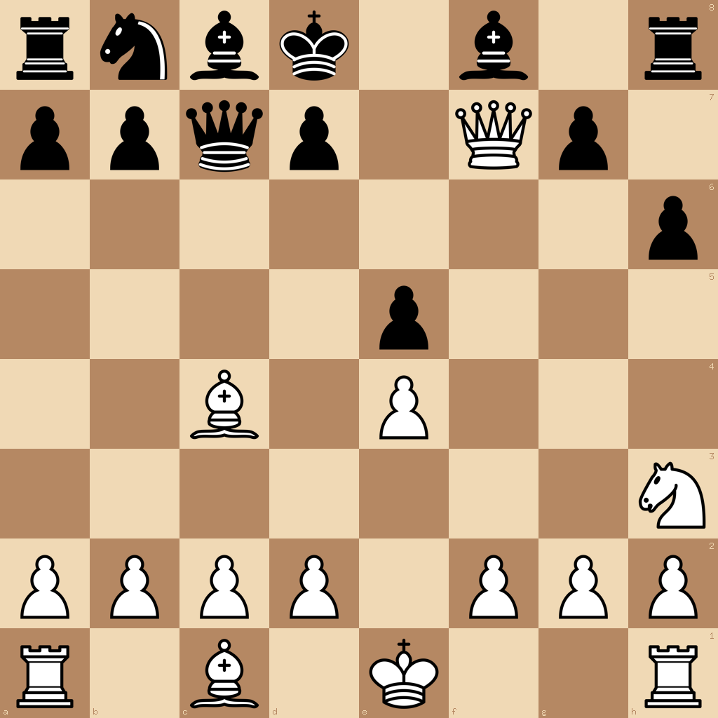 1.e4 Nf6 2.Nc3 Ng4 3.Nh3 e5 4.Qxg4 h6 5.Bc4 Qf6 6.Nd5 Qg6 7.Qf3 Qc6 8.Nxc7+ Qxc7