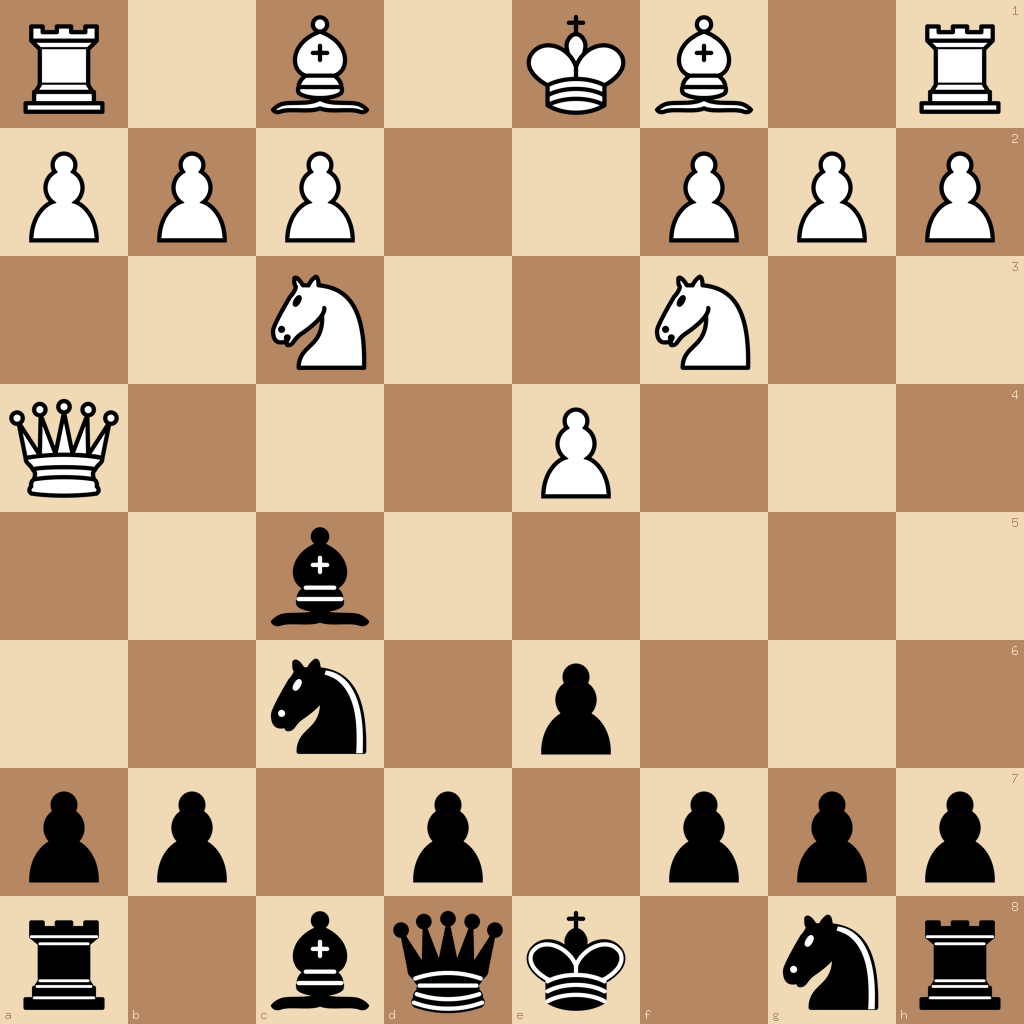1.e4 c5 2.d4 cxd4 3.Qxd4 nc6 4.Qa4 e6 5.Nf3 bc5 6.Nc3 Qb6 7.Bb5 Bxf2+