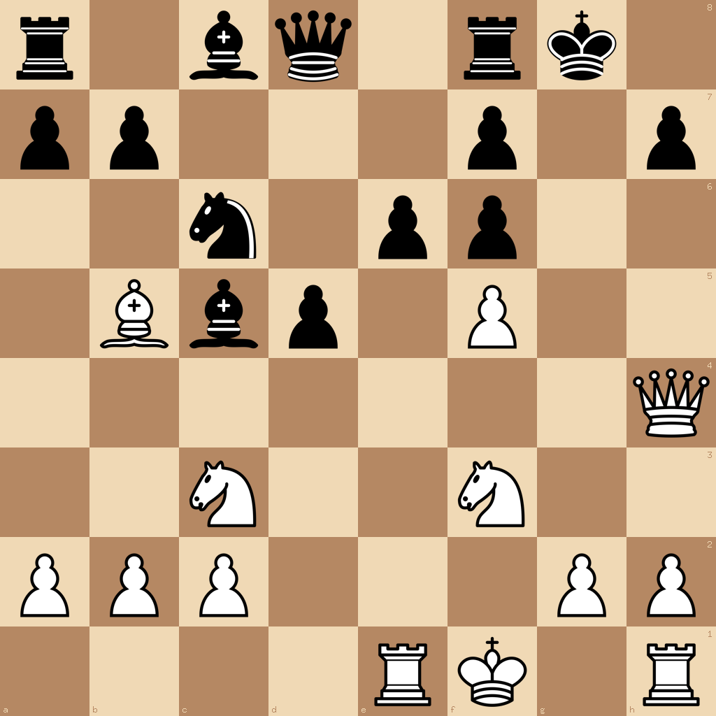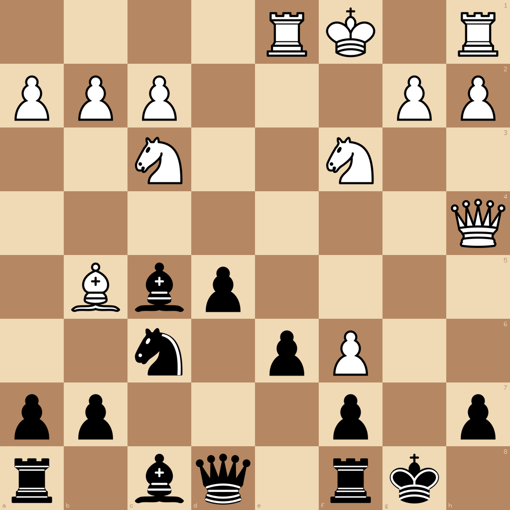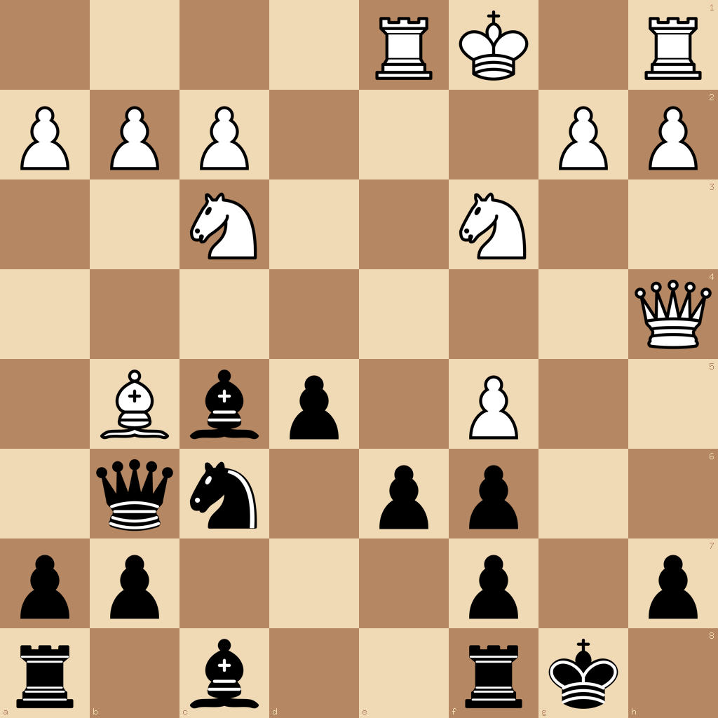 1.e4 c5 2.d4 cxd4 3.Qxd4 nc6 4.Qa4 e6 5.Nf3 bc5 6.Nc3 Qb6 7.Bb5 Bxf2+ 8.Kf1 Bc5 9.exf5 Nf6 10.Bg5 d5 11.Re1+ O-O 12.Bxf6 gxf6 13.Qh4 Qd8