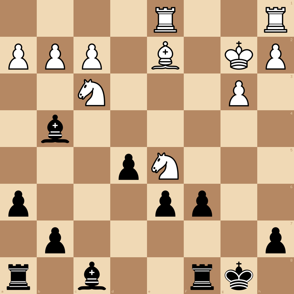 1.e4 c5 2.d4 cxd4 3.Qxd4 nc6 4.Qa4 e6 5.Nf3 bc5 6.Nc3 Qb6 7.Bb5 Bxf2+ 8.Kf1 Bc5 9.exf5 Nf6 10.Bg5 d5 11.Re1+ O-O 12.Bxf6 gxf6 13.Qh4 Qd8 14.f6 Qxf6 15.Qxf6 f6 16.g3 Ne5 17.Kg2 a6 18.Be2 Bb4