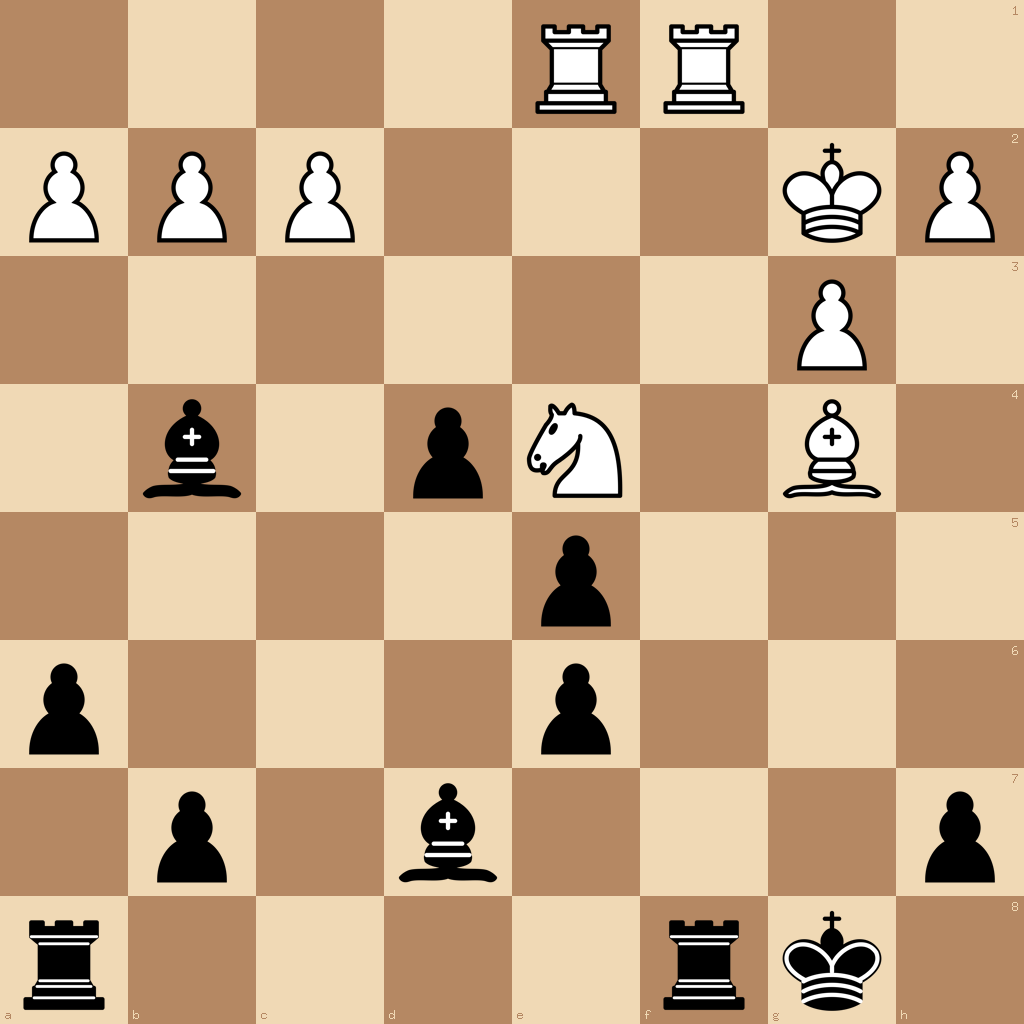 1.e4 c5 2.d4 cxd4 3.Qxd4 nc6 4.Qa4 e6 5.Nf3 bc5 6.Nc3 Qb6 7.Bb5 Bxf2+ 8.Kf1 Bc5 9.exf5 Nf6 10.Bg5 d5 11.Re1+ O-O 12.Bxf6 gxf6 13.Qh4 Qd8 14.f6 Qxf6 15.Qxf6 f6 16.g3 Ne5 17.Kg2 a6 18.Be2 Bb4 19.Nxe5 fxe5 20.Rhf1 Bd7 21.Bg4 d4 22.Ne4