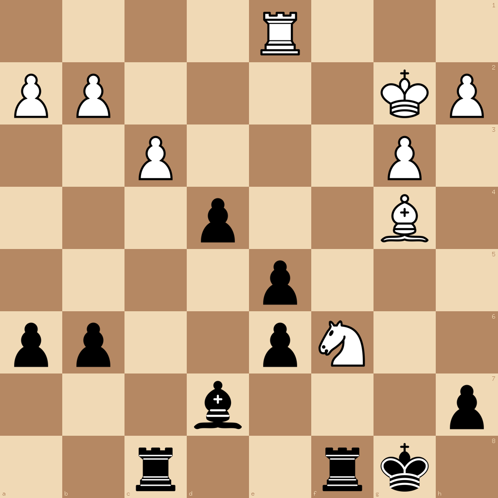 1.e4 c5 2.d4 cxd4 3.Qxd4 nc6 4.Qa4 e6 5.Nf3 bc5 6.Nc3 Qb6 7.Bb5 Bxf2+ 8.Kf1 Bc5 9.exf5 Nf6 10.Bg5 d5 11.Re1+ O-O 12.Bxf6 gxf6 13.Qh4 Qd8 14.f6 Qxf6 15.Qxf6 f6 16.g3 Ne5 17.Kg2 a6 18.Be2 Bb4 19.Nxe5 fxe5 20.Rhf1 Bd7 21.Bg4 d4 22.Ne4 Bxe1 23.Rxe1 Rac8