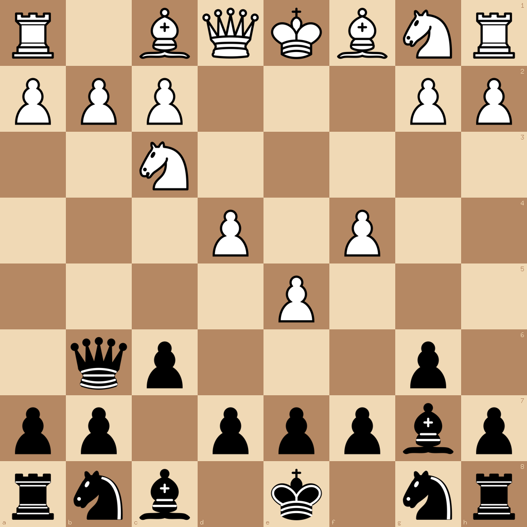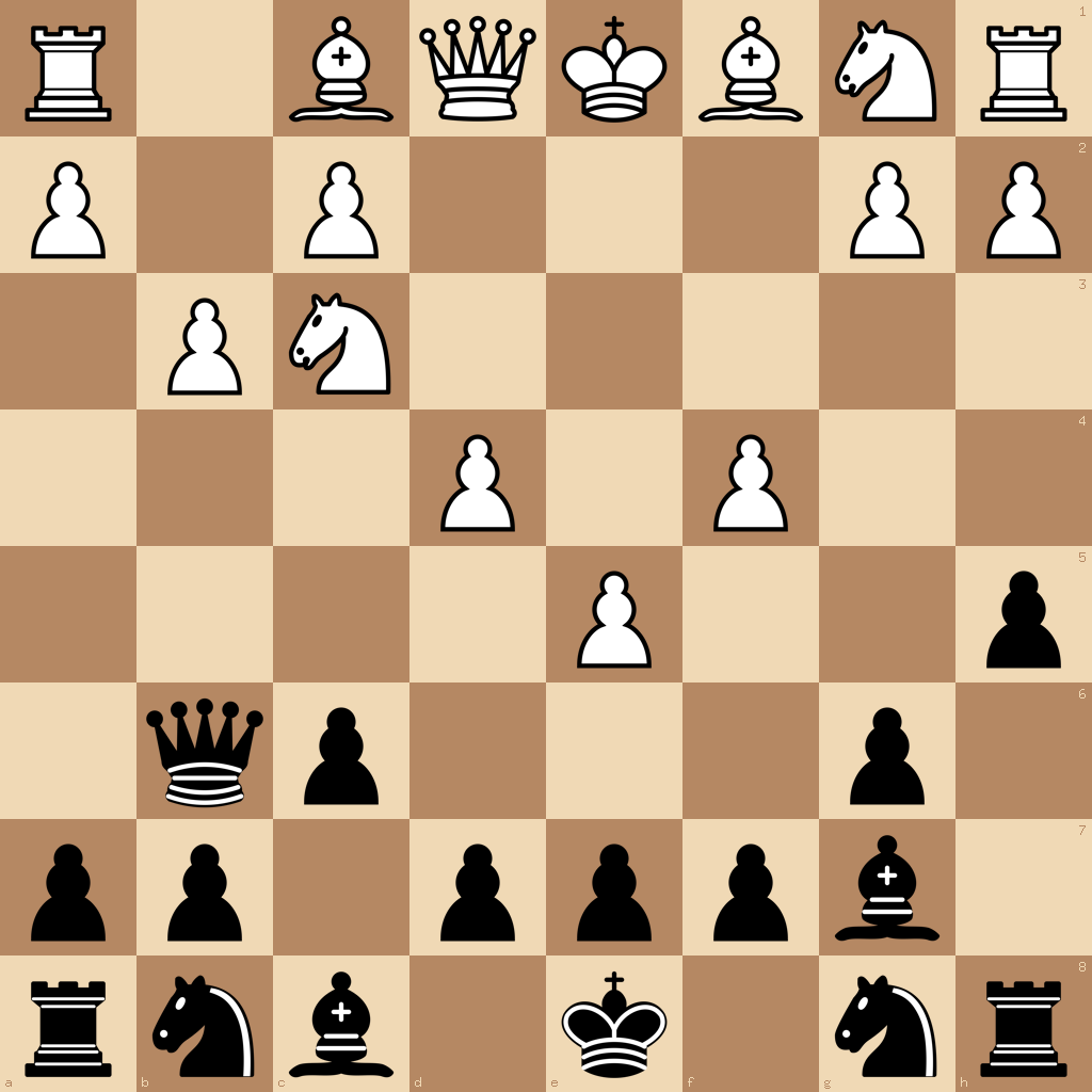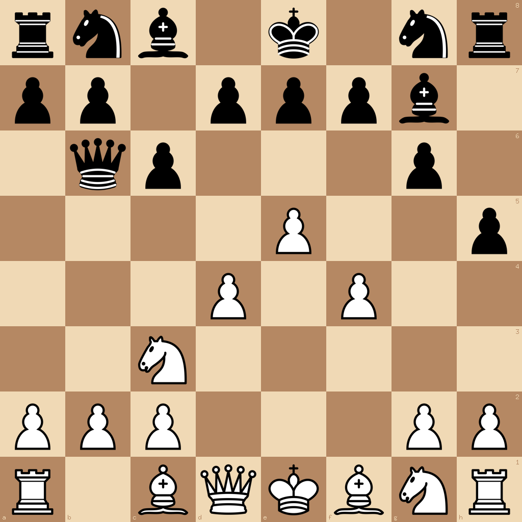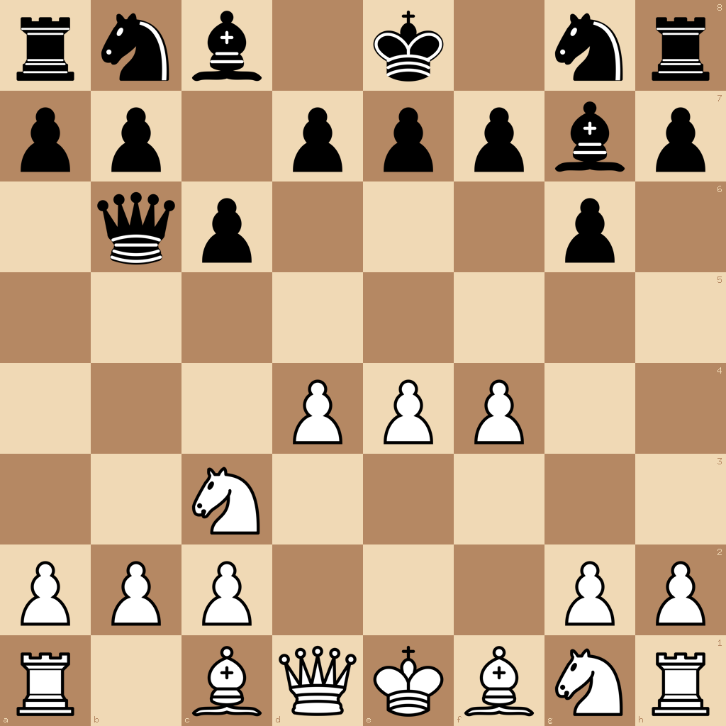 1.d4 c6 2.e4 g6 3.Nc3 Bg7 4.f4 Qb6 5.e5 h5 6.b3