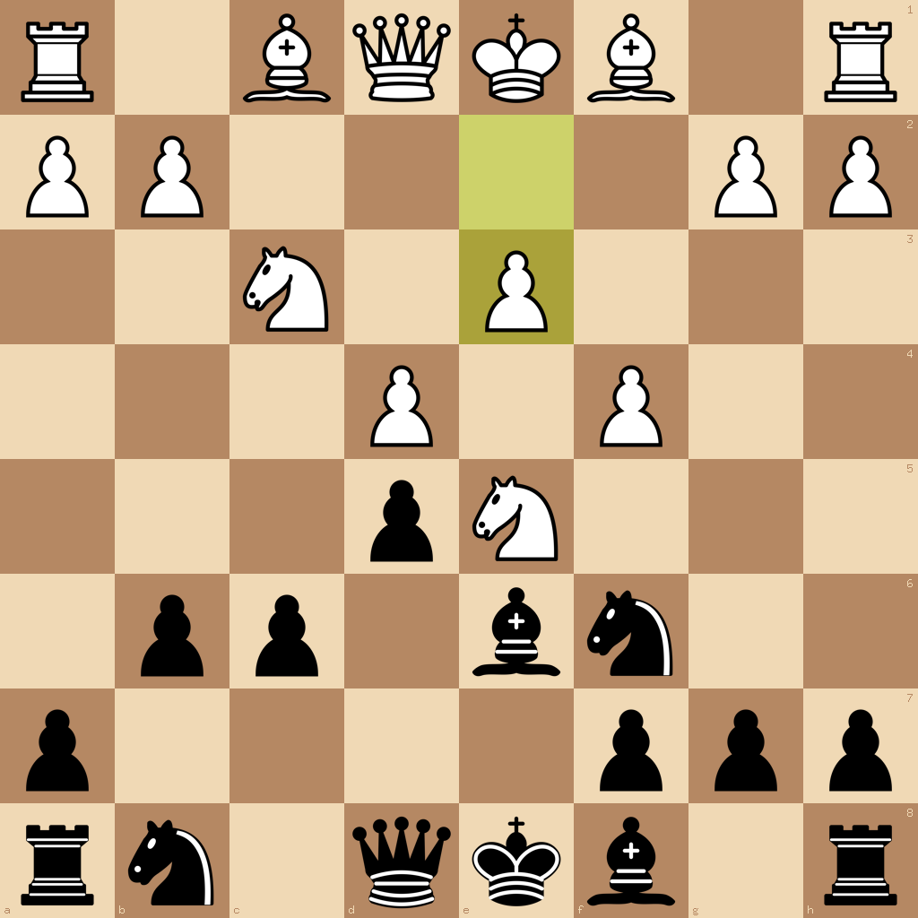1.d4 d5 2.c4 e6 3.Nc3 b6 4.Nf3 Nf6 5.cxd5 exd5 6.Ne5 Be6 7.f4 c6 8.e3