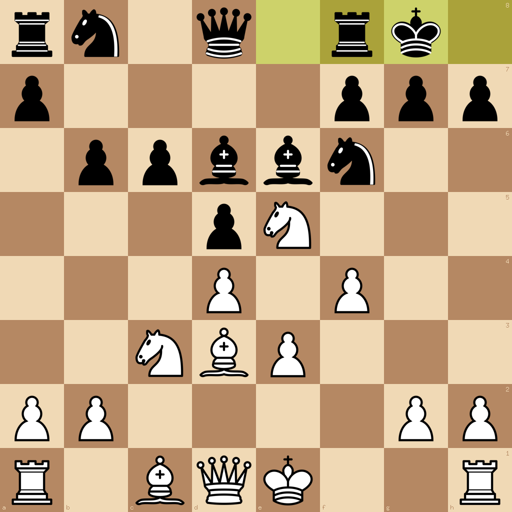 1.d4 d5 2.c4 e6 3.Nc3 b6 4.Nf3 Nf6 5.cxd5 exd5 6.Ne5 Be6 7.f4 c6 8.e3 Bd6 9.Bd3 O-O