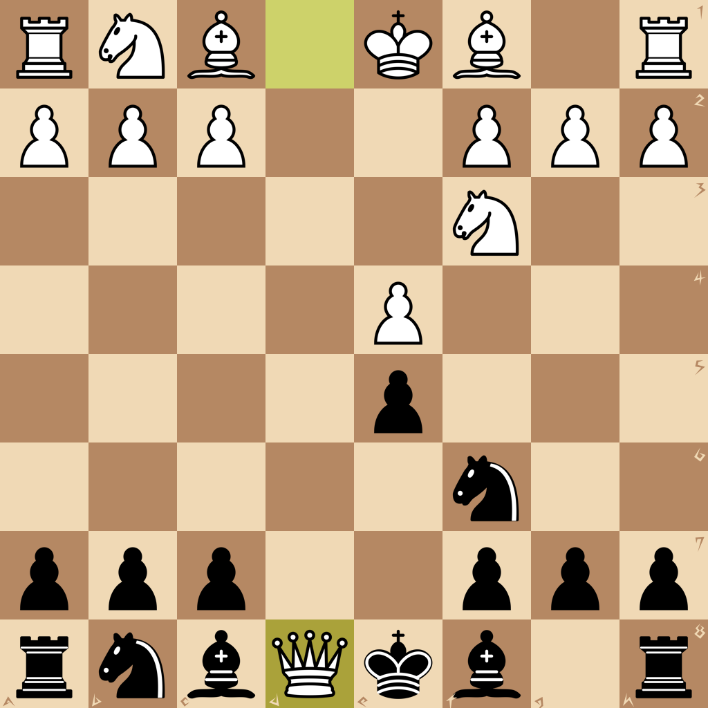 1.e4 e5 2.Nf3 d6 3.d4 Nf6 4.dxe5 dxe5 5.Qxd8+