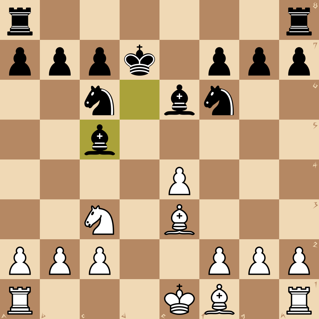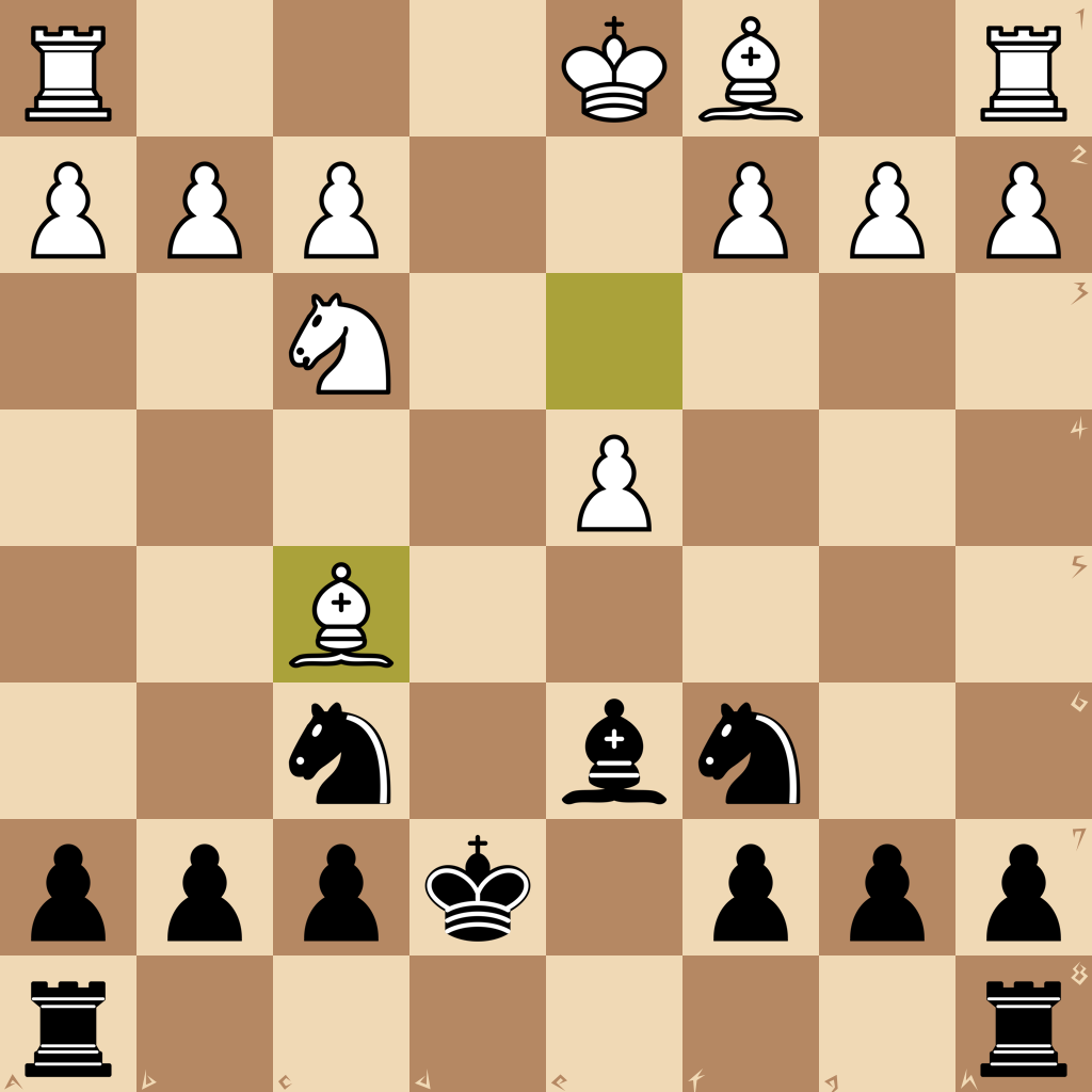 1.e4 e5 2.Nf3 d6 3.d4 Nf6 4.dxe5 dxe5 5.Qxd8+ Kxd8 6.Nxe5 Be6 7.Nc3 Bd6 8.Nd3 Nc6 9.Be3 Kd7 10.Nc5+