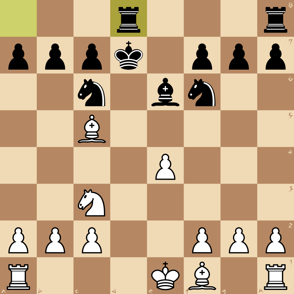 1.e4 e5 2.Nf3 d6 3.d4 Nf6 4.dxe5 dxe5 5.Qxd8+ Kxd8 6.Nxe5 Be6 7.Nc3 Bd6 8.Nd3 Nc6 9.Be3 Kd7 10.Nc5+ Bxc5 11.Bxc5 Rad8