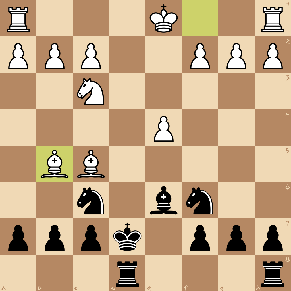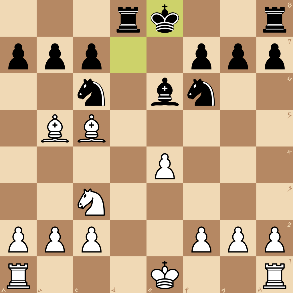 1.e4 e5 2.Nf3 d6 3.d4 Nf6 4.dxe5 dxe5 5.Qxd8+ Kxd8 6.Nxe5 Be6 7.Nc3 Bd6 8.Nd3 Nc6 9.Be3 Kd7 10.Nc5+ Bxc5 11.Bxc5 Rad8 12.Bb5 Ke8