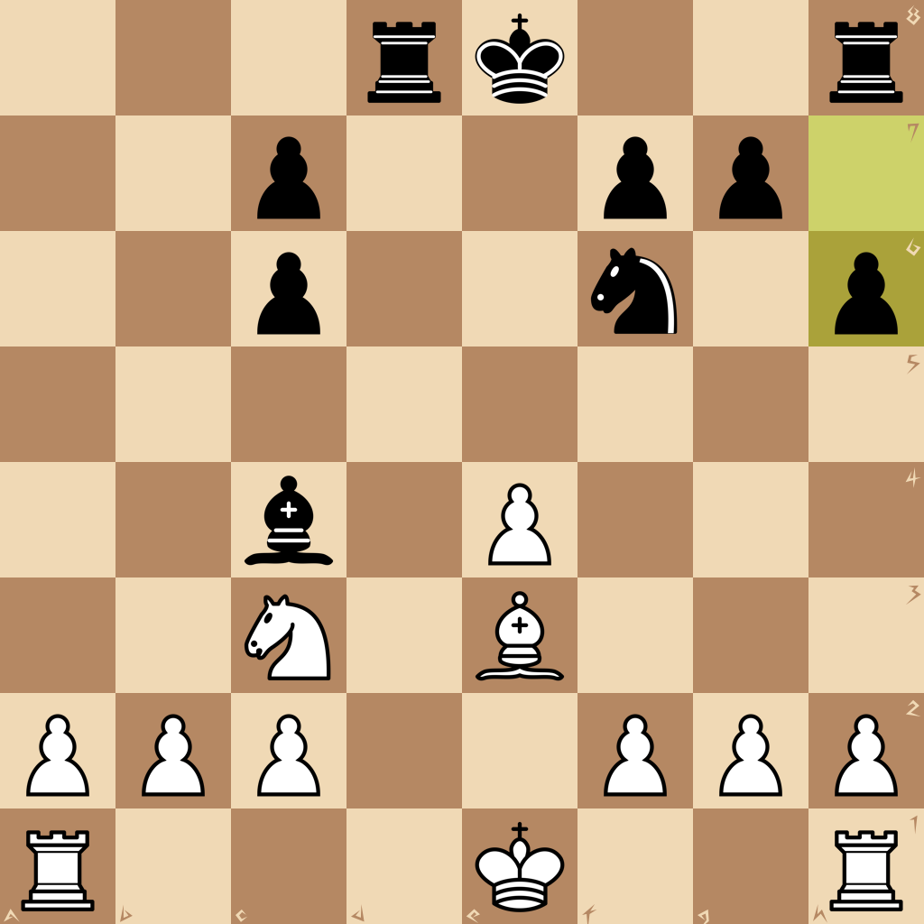 1.e4 e5 2.Nf3 d6 3.d4 Nf6 4.dxe5 dxe5 5.Qxd8+ Kxd8 6.Nxe5 Be6 7.Nc3 Bd6 8.Nd3 Nc6 9.Be3 Kd7 10.Nc5+ Bxc5 11.Bxc5 Rad8 12.Bb5 Ke8 13.Bxc6+ bxc6 14.Bxa7 Bc4 15.Be3 h6