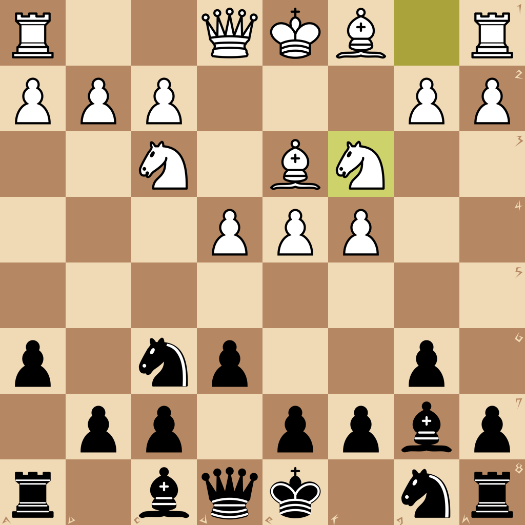 1.e4 g6 2.d4 Bg7 3.Nc3 d6 4.f4 Nc6 5.Be3 a6 6.Nf3 Nh6