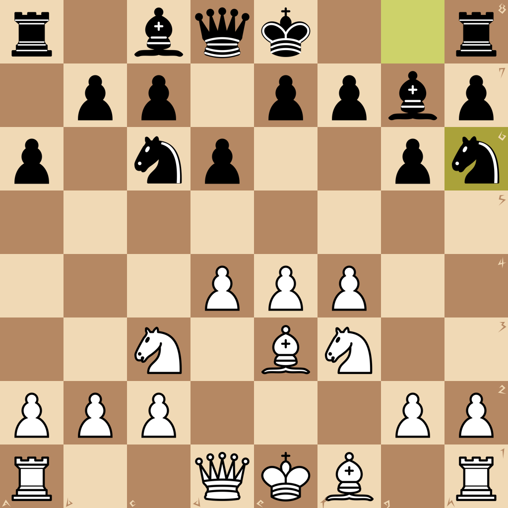 1.e4 g6 2.d4 Bg7 3.Nc3 d6 4.f4 Nc6 5.Be3 a6 6.Nf3 Nh6