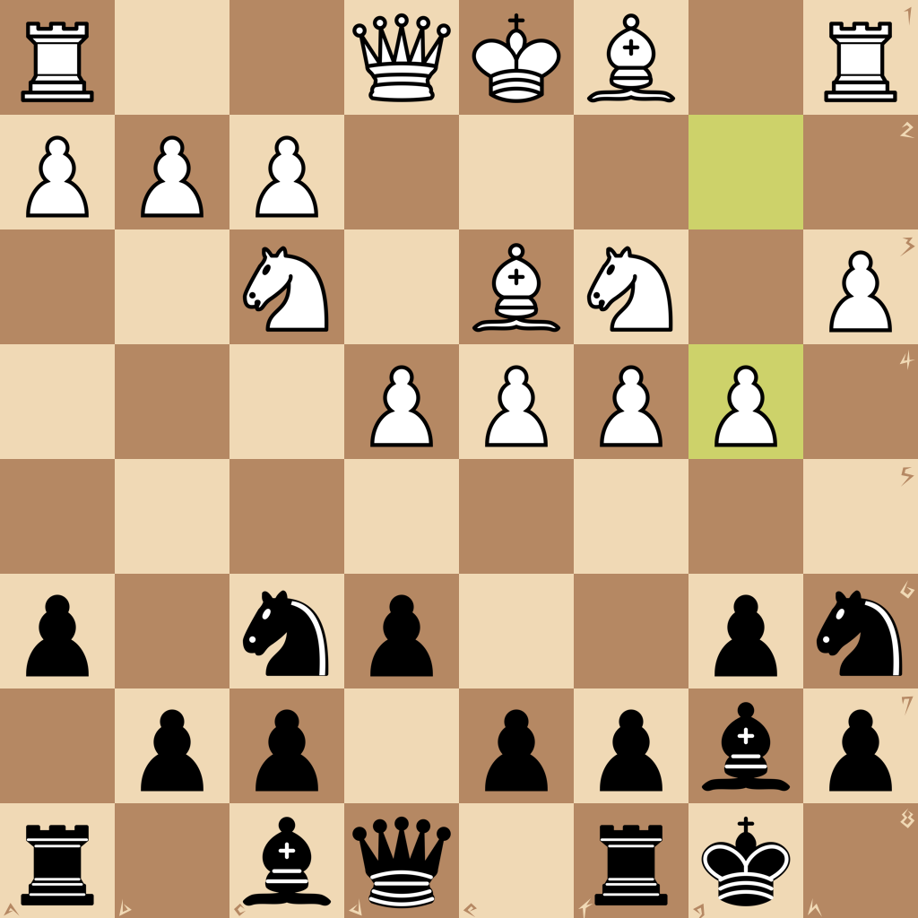 1.e4 g6 2.d4 Bg7 3.Nc3 d6 4.f4 Nc6 5.Be3 a6 6.Nf3 Nh6 7.h3 O-O 8.g4