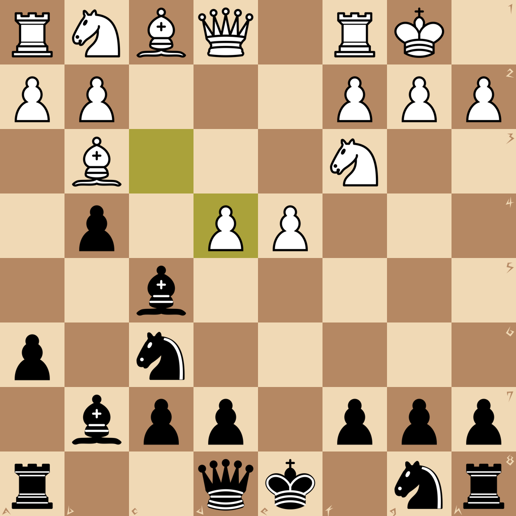 1.e4 e5 2.Nf3 Nc6 3.Bb5 a6 4.Ba4 b5 5.Bb3 Bb7 6.O-O Bc5 7.c3 b4 8.d4 exd4 9.cxd4