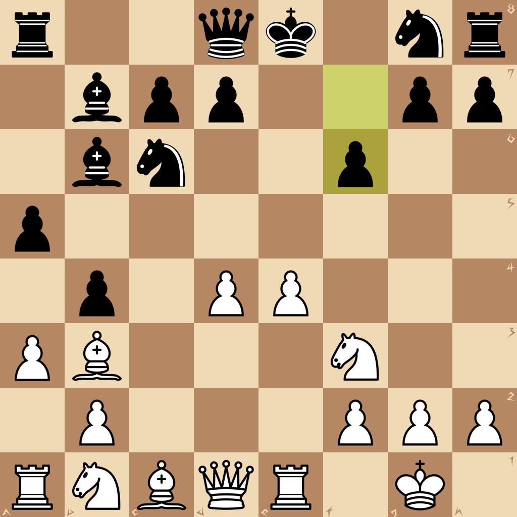 1.e4 e5 2.Nf3 Nc6 3.Bb5 a6 4.Ba4 b5 5.Bb3 Bb7 6.O-O Bc5 7.c3 b4 8.d4 exd4 9.cxd4 Bb6 10.a3 a5 11.Re1 f6 12.e5