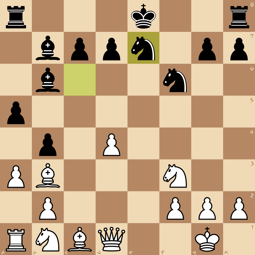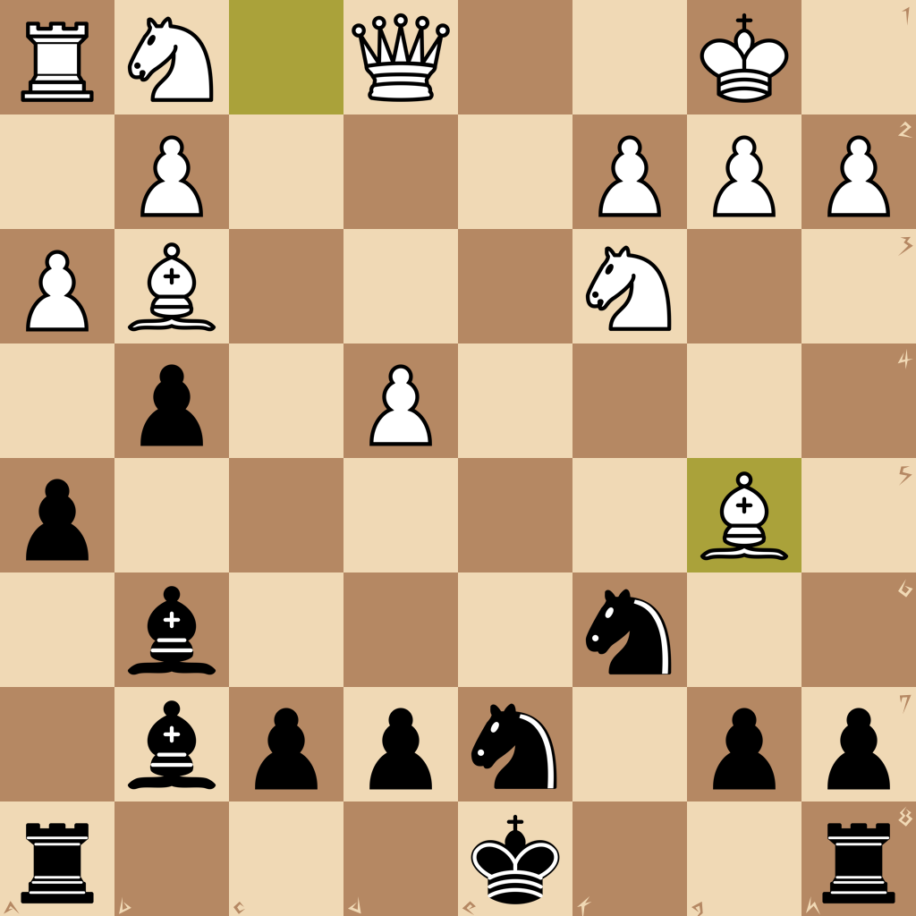 1.e4 e5 2.Nf3 Nc6 3.Bb5 a6 4.Ba4 b5 5.Bb3 Bb7 6.O-O Bc5 7.c3 b4 8.d4 exd4 9.cxd4 Bb6 10.a3 a5 11.Re1 f6 12.e5 Qe7 13.exf6 Nf6 14.Rxe7+ Ne7 15.Bg5