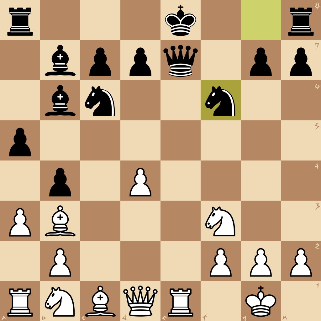 1.e4 e5 2.Nf3 Nc6 3.Bb5 a6 4.Ba4 b5 5.Bb3 Bb7 6.O-O Bc5 7.c3 b4 8.d4 exd4 9.cxd4 Bb6 10.a3 a5 11.Re1 f6 12.e5 Qe7 13.exf6 Nf6 14.Rxe7+ Ne7 15.Bg5 O-O-O