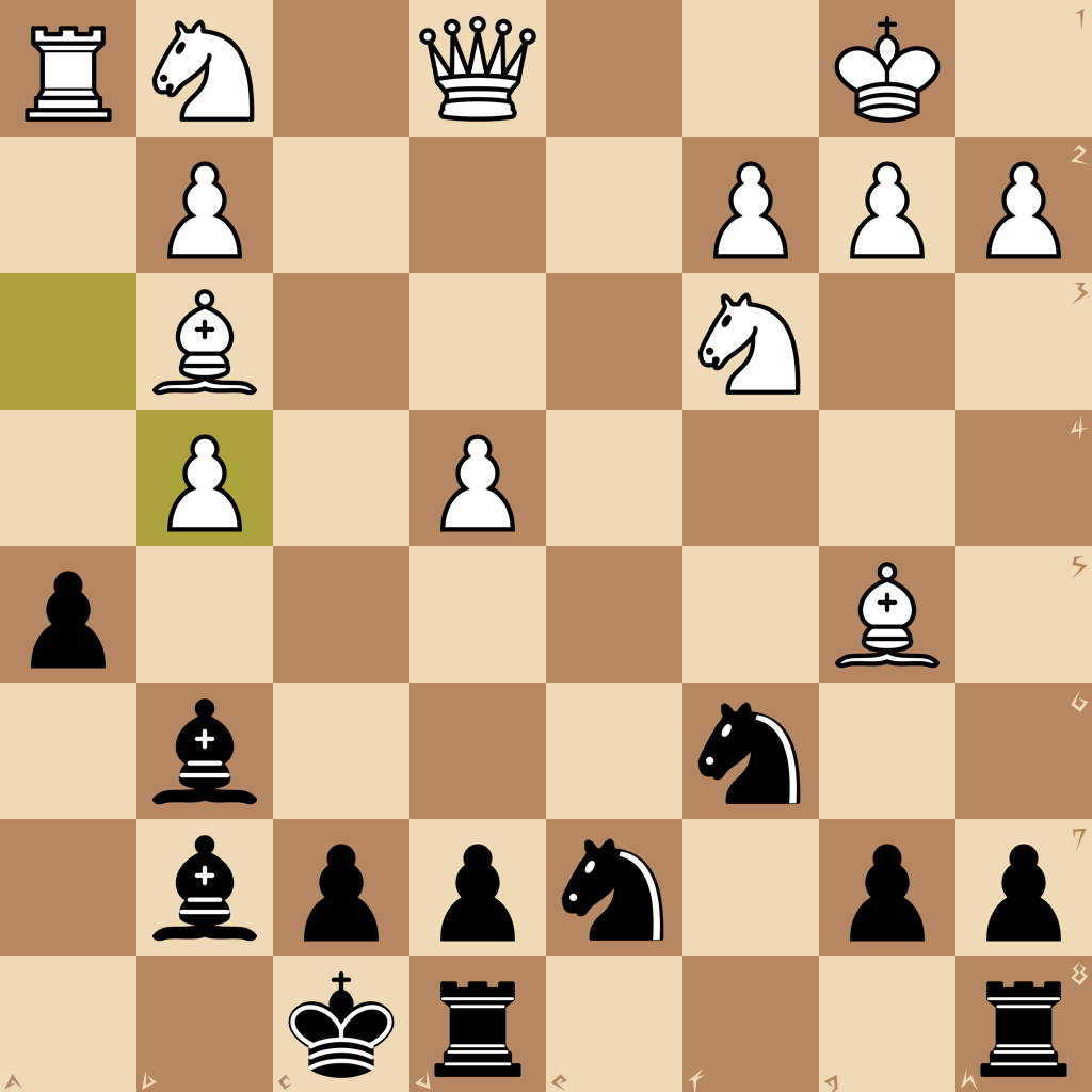 1.e4 e5 2.Nf3 Nc6 3.Bb5 a6 4.Ba4 b5 5.Bb3 Bb7 6.O-O Bc5 7.c3 b4 8.d4 exd4 9.cxd4 Bb6 10.a3 a5 11.Re1 f6 12.e5 Qe7 13.exf6 Nf6 14.Rxe7+ Ne7 15.Bg5 O-O-O 16.axb4