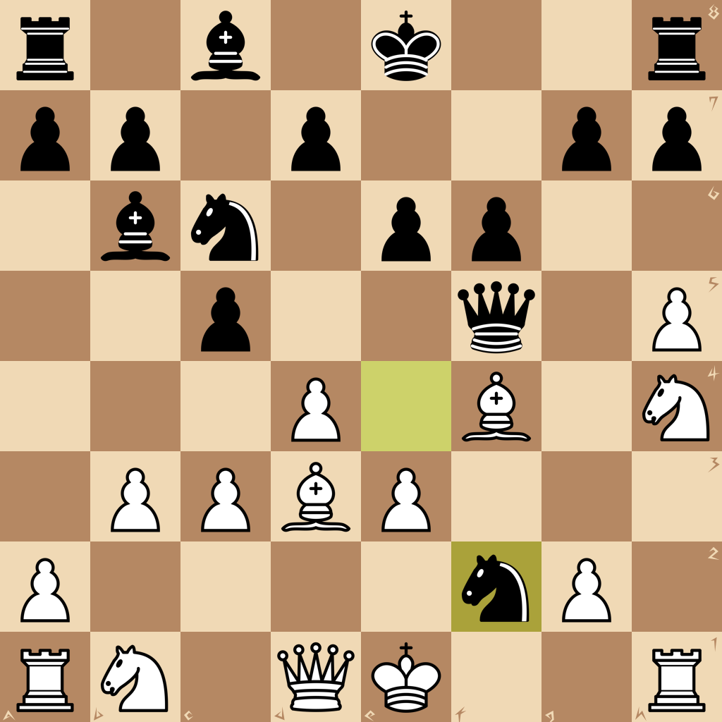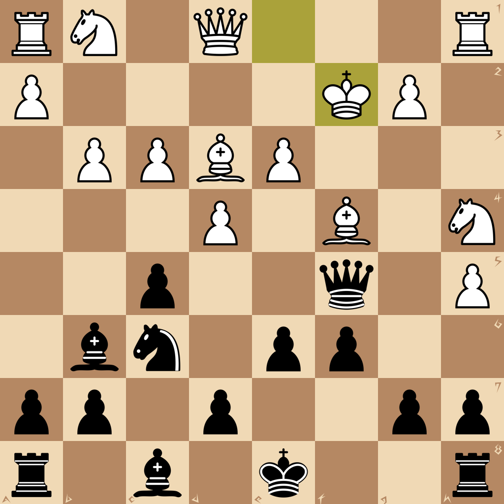1.h3 e6 2.b3 Qf6 3.c3 Bc5 4.d4 Bb6 5.Nf3 c5 6.Bg5 Qg6 7.e3 Nf6 8.Bd3 Ne4 9.h4 f6 10.h5 Qf5 11.Bf4 Nc6 12.Nh4 Nf2 13.Kxf2